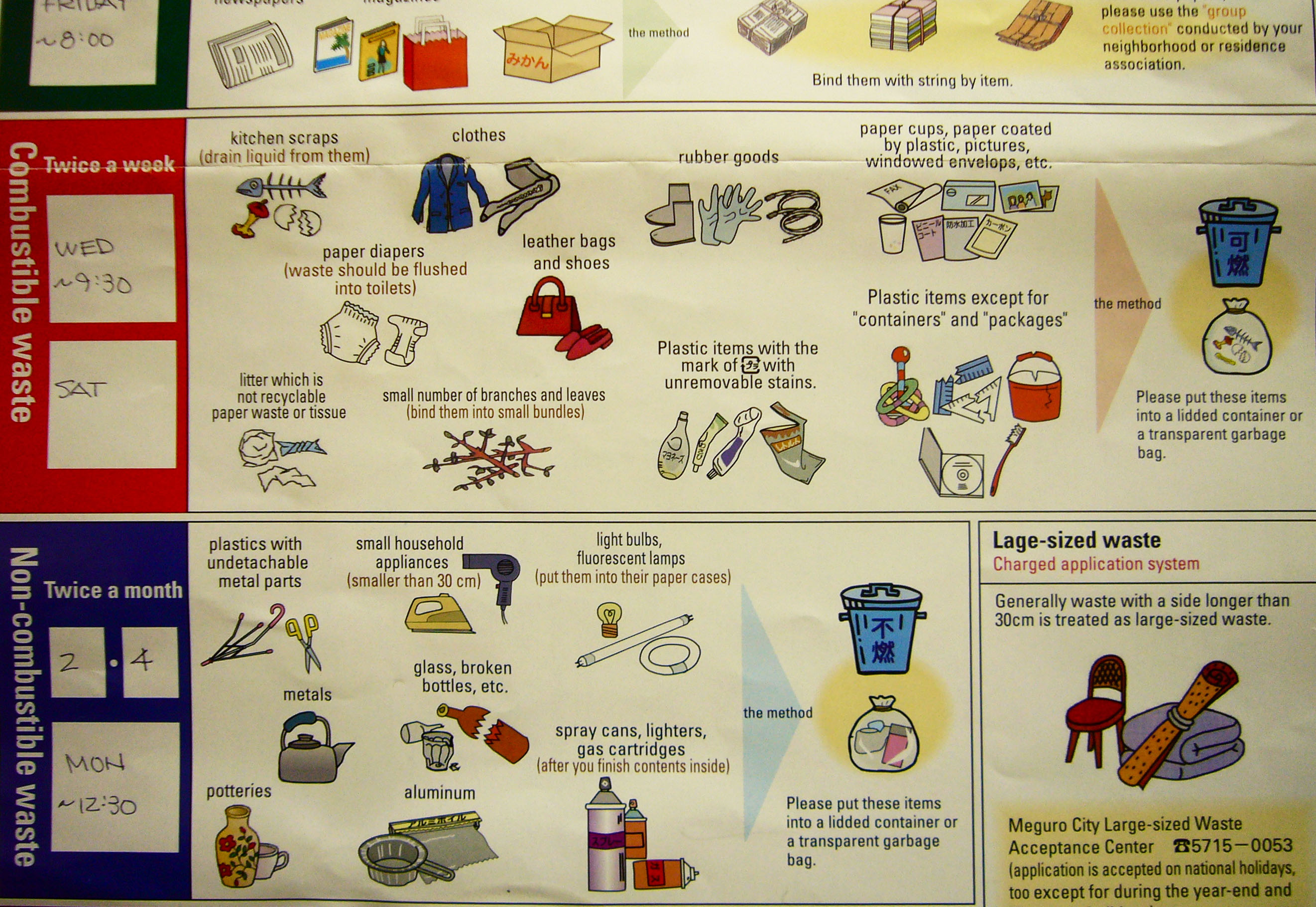 And that’s just the Saturday list. Garbage is collected here five days a week, but it’s different stuff every day. Monday is Non-Combustible Waste Day, Wednesday they cart away Combustible Waste again, Thursday is paper goods, and Friday is four kinds of recyclables (all items washed, crushed or bundled and bagged by type).