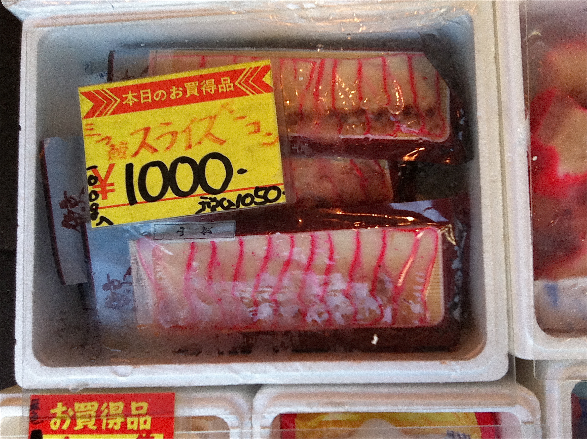 The friend I went to the Tsukiji Outer Market with this week told me that when she was growing up in Kyushu, the only kind of bacon they ever had at home was whale bacon. Apparently, it’s always eaten raw, so when she was reading an American book years later and the dialogue was about the smell of frying bacon wafting through the house in the morning, her first thought was, “EWWWW!”