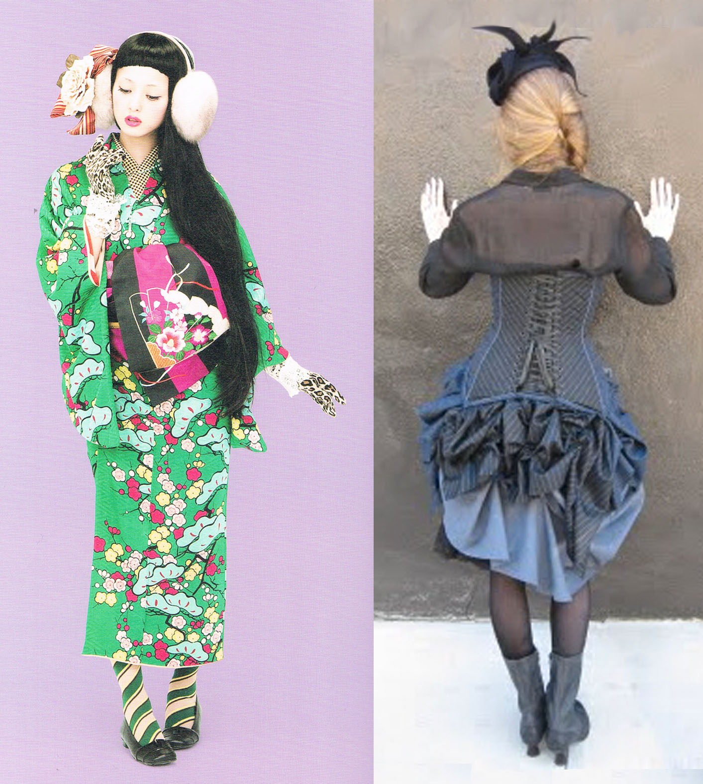 In the photos above, the vintage kimono with modern Harajuku-style accessories is from a spread in Yamato Kimono-hime magazine; the corset, skirt and hat on the right are a custom order from Kaliko Delafay’s Dollymop line, sold through Dark Garden in San Francisco.