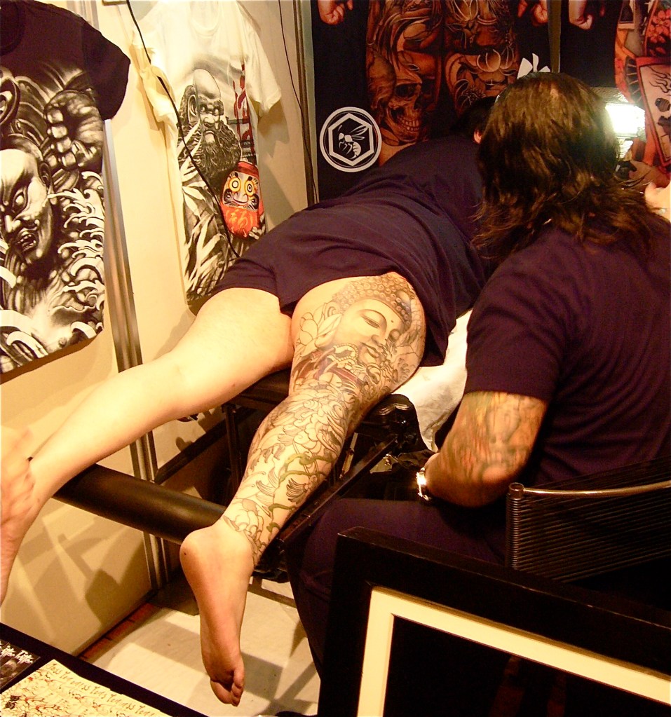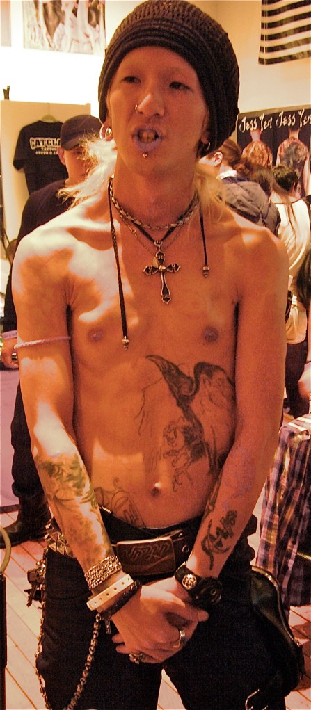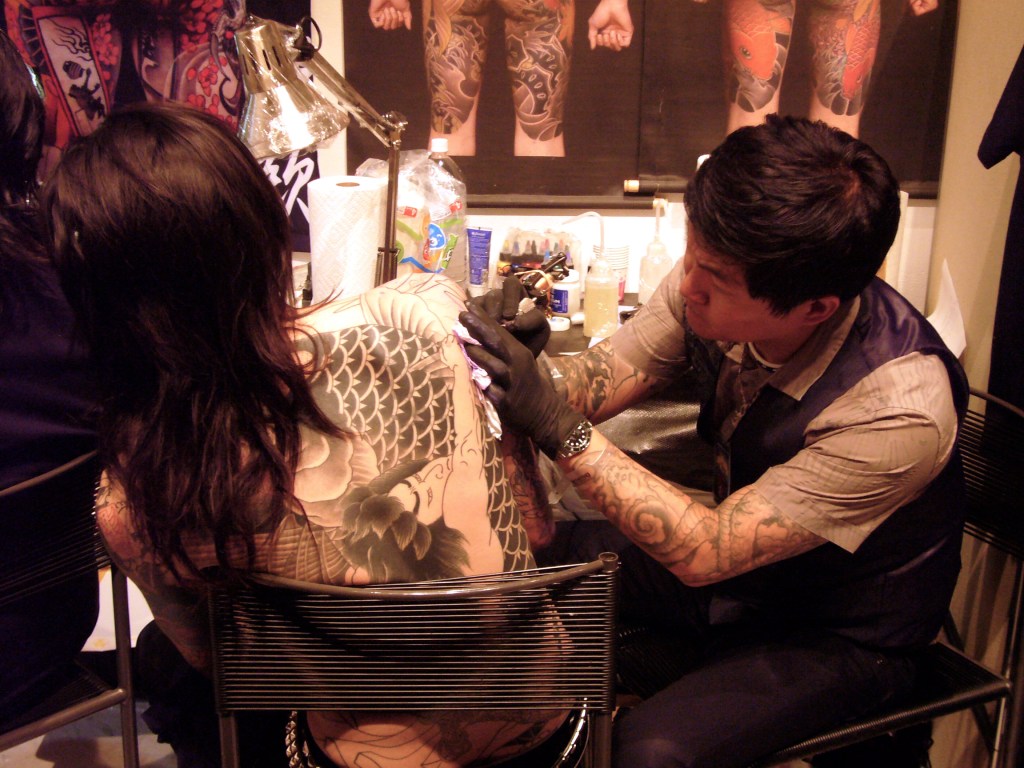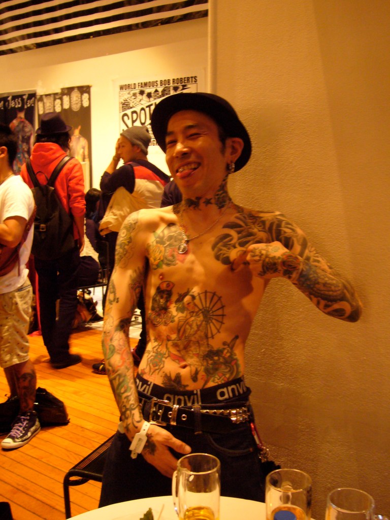 People from all over the world flew in to be worked on by the international artists at the King of Tattoo three-day inkfest in Daikanyama yesterday. I don’t have any tattoos myself, but I’ve always been interested in art that has to adapt to its environment (like, say, being applied to an arm rather than a nice flat sheet of paper) and in the decisions people make when they change their bodies in such a permanent way.