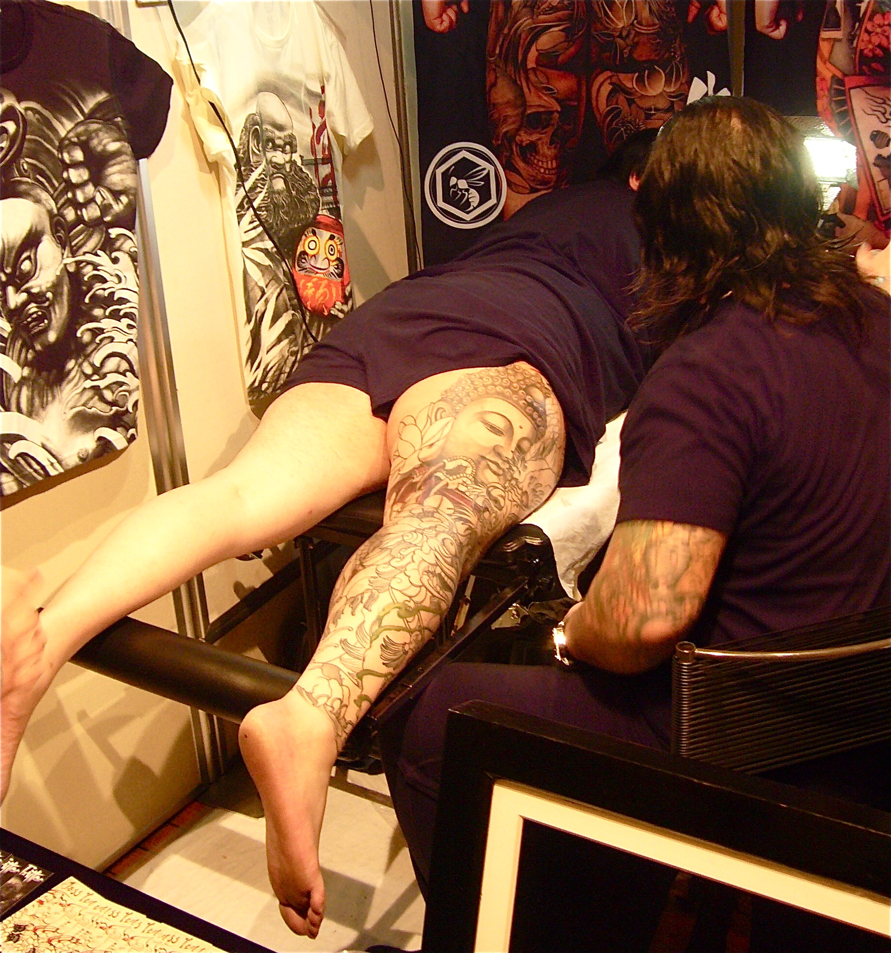 King of Tattoo did not disappoint. I talked to one of the disciples of an artist known for his traditional-style full-body work, and discovered that there’s a 3-4 year wait to get an appointment. He charges $250 an hour, and a full body tattoo runs “about the same as a new BMW.” The apprentice told me that studying under this particular artist wasn’t like school; it was more like entering a monastery. When I asked him about his own tattoos (done by his sensei, of course) he told me he didn’t have any idea what the design was going to be until it was on his skin. After seeing his sensei’s work, though, I could see why someone would trust him to choose. Easily some of the most beautiful drawing I’ve ever seen. (The photo below is the work of this artist.)