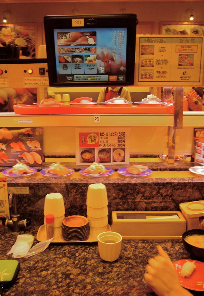 Conveyor belt sushi joints are a fast food fixture in Japan, but I’d never been to one that delivered the special orders on a red speedboat before. This place near my Japanese school in Takanobaba has a system: each setting is outfitted with its own touchscreen, and you can choose up to four plates at a time. The order goes to the sushi chef in the kitchen at the end of the roundabout, and when your order is ready, he loads it onto a long red boat that zooms to a stop in front of your seat. You remove the plates and press a flashing red button to let him know he can recall the boat and deliver his next order. While you’re waiting, you can grab any of the tempting plates sliding by on the conveyor belt too, but the order system gets you in and out in record time – a salaryman’s dream. Even better, my eight-piece, fabulously fresh sushi lunch cost ¥660 (about $8.50).
