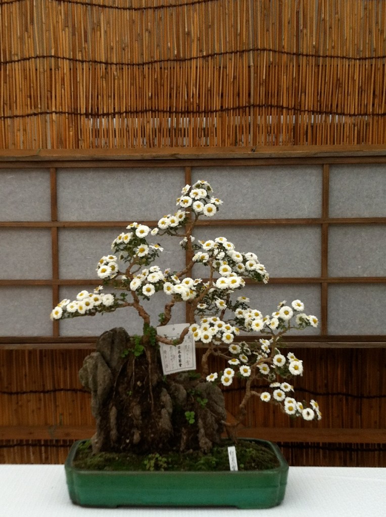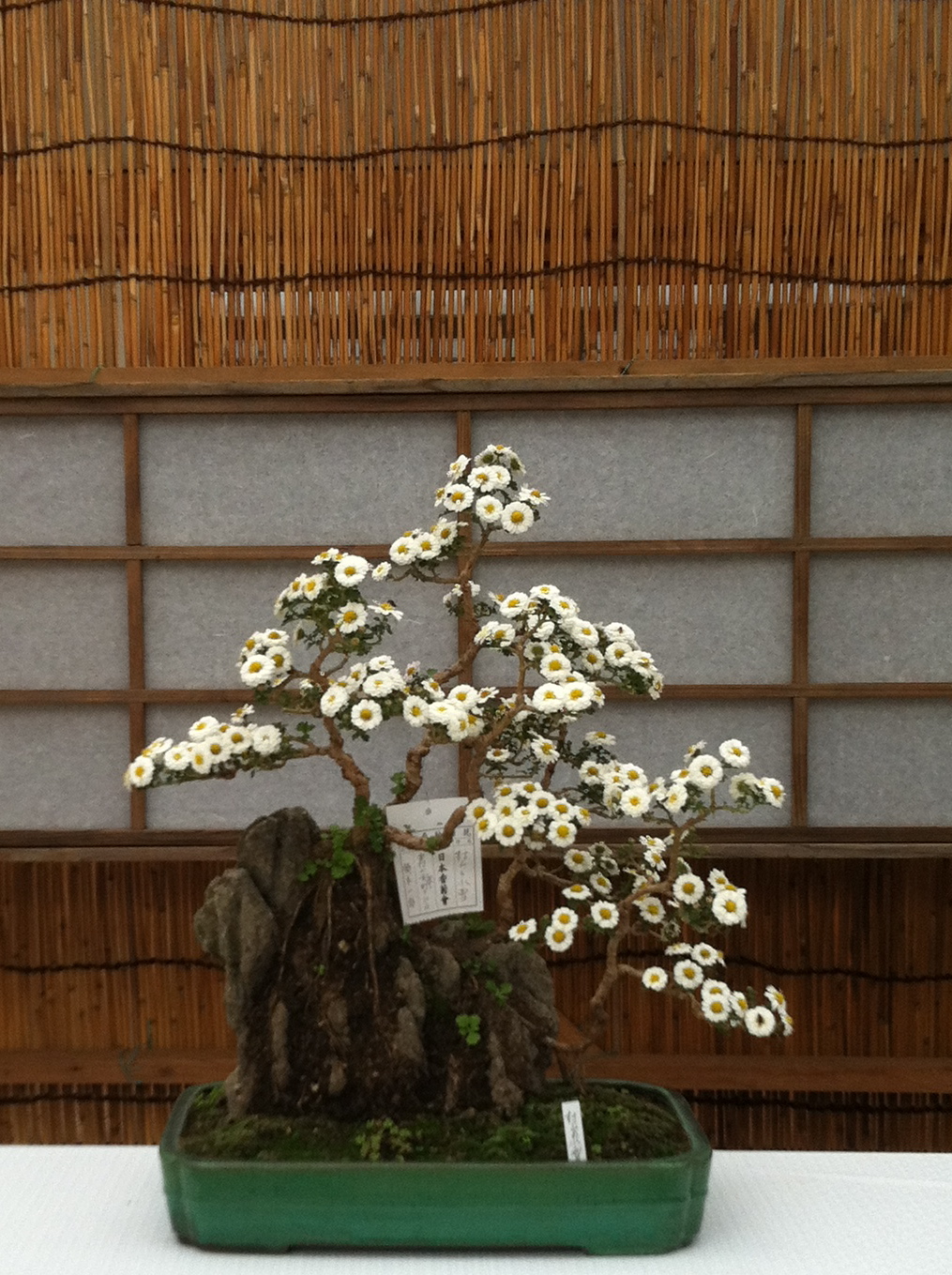 Yep, it’s a bonsai chrysanthemum. I saw this prize specimen at the Yasukuni Shrine last weekend. It’s the wickedly competitive chrysanthemum exhibiting season in Japan right now, and shrines all over Tokyo have erected little huts filled with obsessively nurtured flowers. Not only do the un-bonsaied varieties have to be perfectly symmetrical, with their blooms and leaves blemish-free, there have to be THREE perfect plants per pot, they all have to be the same height, and they all have to bloom at exactly the same time. Somewhere there must be volumes of arcana dealing with how to achieve this, because there are so many perfect entries to these competitions every November.