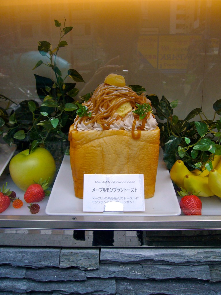 This “Maple Monbranc” Honey Toast is just what it looks like: a solid half loaf of white bread topped with ice cream, maple syrup, prolific extrusions of sweetened chestnut paste, whipped cream, half a candied chestnut and two sprigs of parsley. This is just one variety – you can order your slab of goodness topped with berries, chocolate, caramel, you name it.