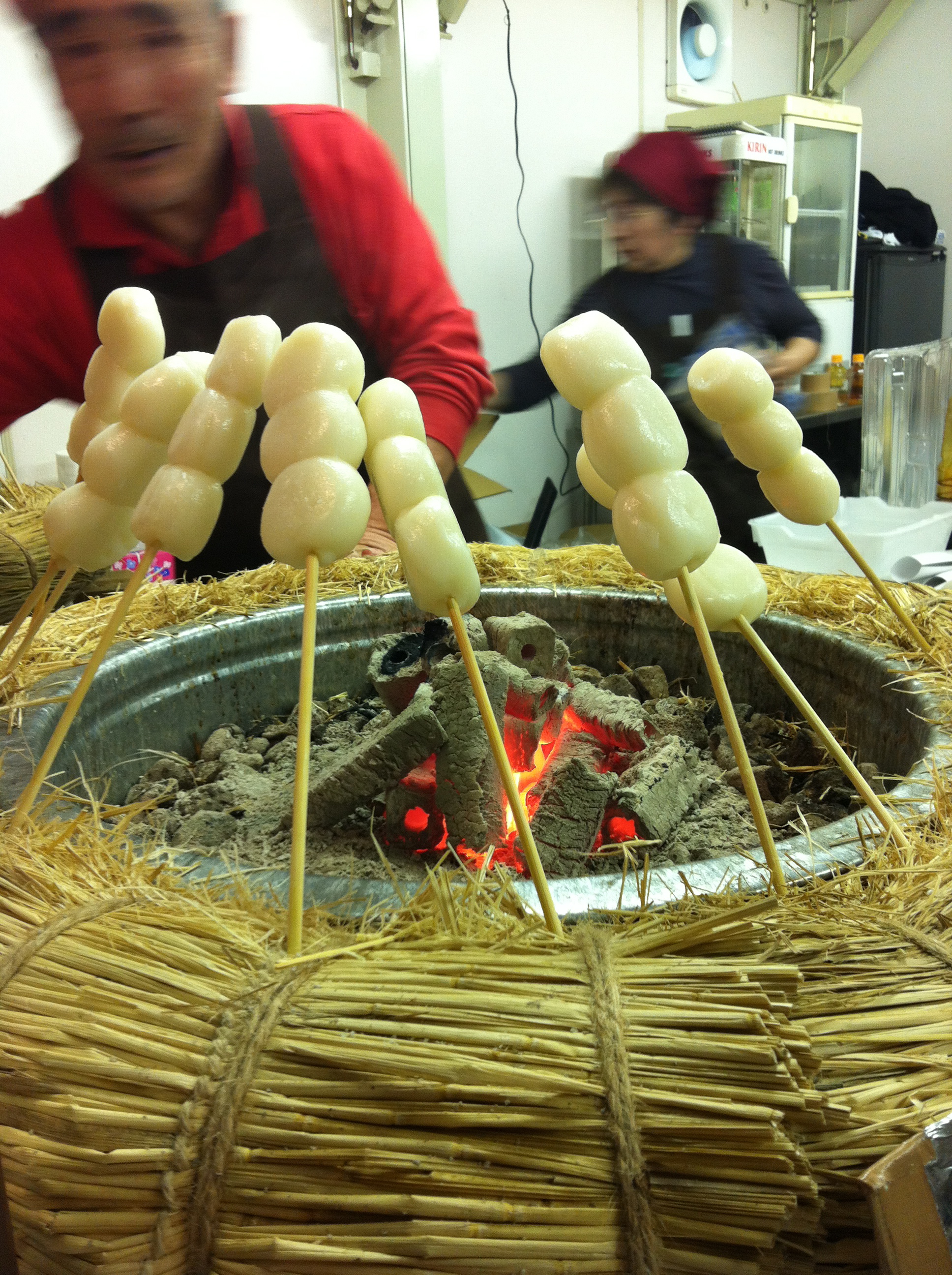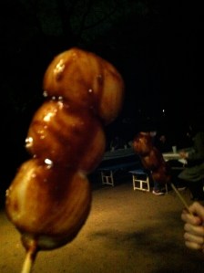 On the last night that the fall leaves were illuminated at Rikugi-en, we stumbled across the mitarashi dango stand. In a little hut beneath the maple trees, this man and his wife were dishing up skewers of rice cakes, roasted over charcoal and slathered with miso sauce. Sometimes mitarashi dango – the traditional balls made of rice that’s been pounded into a gooey paste – are too sticky or too rubbery or too tough, but these were delectably chewy, not to mention comfortingly warm on a chilly evening. If I didn’t know that a crock of rice as big as my head had been reduced to these bite-sized balls, I’d have been tempted to eat several more. Here’s what mine looked like, moments before its demise :