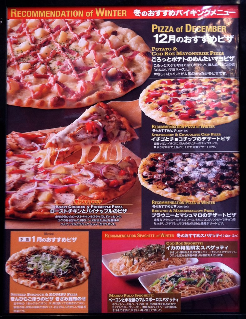 I didn’t think Shakey’s could top the red bean, marshmallow and squash dessert pizza, but their winter specials just might surpass that creation for sheer originality. When the most ordinary offering among them is called “Roast Chicken & Pineapple,” you know you’re in for some culinary surprises.