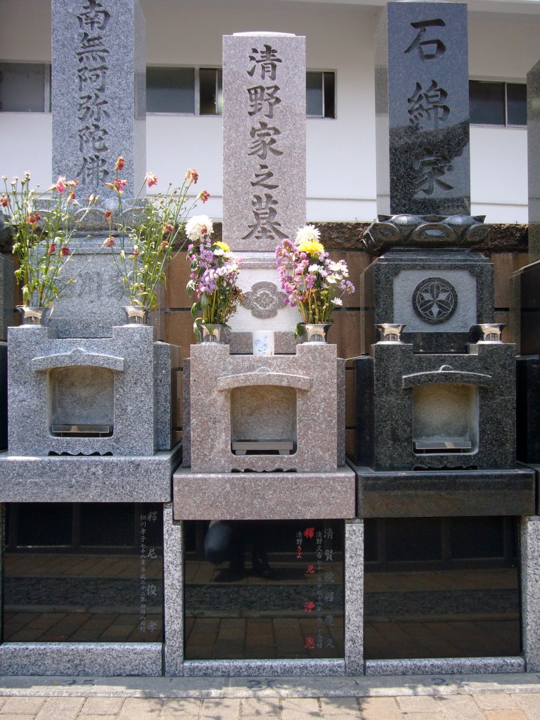You can tell a thoughtful friend or family member recently visited, because they filled the dear departed’s favorite teacup with o-cha and left behind bouquets of chrysanthemums (which are so associated with funerals that it’s considered bad luck to give them on any other occasion, especially when visiting someone in the hospital). And see the red characters carved in the stone below? Those are the names of family members who are planning to have their ashes interred in this family crypt when the time comes for them to depart this earthly vale. It’s less expensive to have everybody’s name carved at once when the first person is interred, but bad luck to have your name already on a gravestone while you’re alive. The solution is to fill the names of the living with red paint, and remove it when their ashes join those gone before.