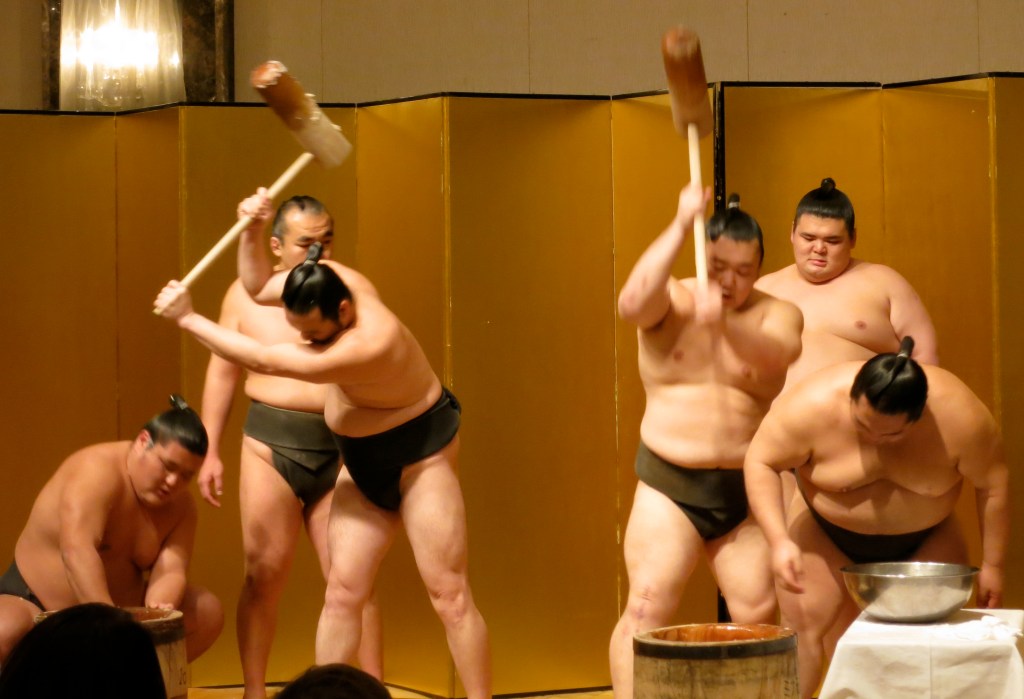 It wouldn’t be New Years in Japan without pounding down a stomach-full of mochi, and who better to bludgeon the rice into sticky submission than a cadre of sumo wrestlers? Today I watched as six mighty sumo-sans took turns wielding the mallet and flipping the doughy mass so no grain escaped the hammer of doom. This operation requires a fine sense of timing, because the entire blob of sticky rice needs to be deftly turned in between strokes, or the turner ends up with the mother of all smashed fingers.