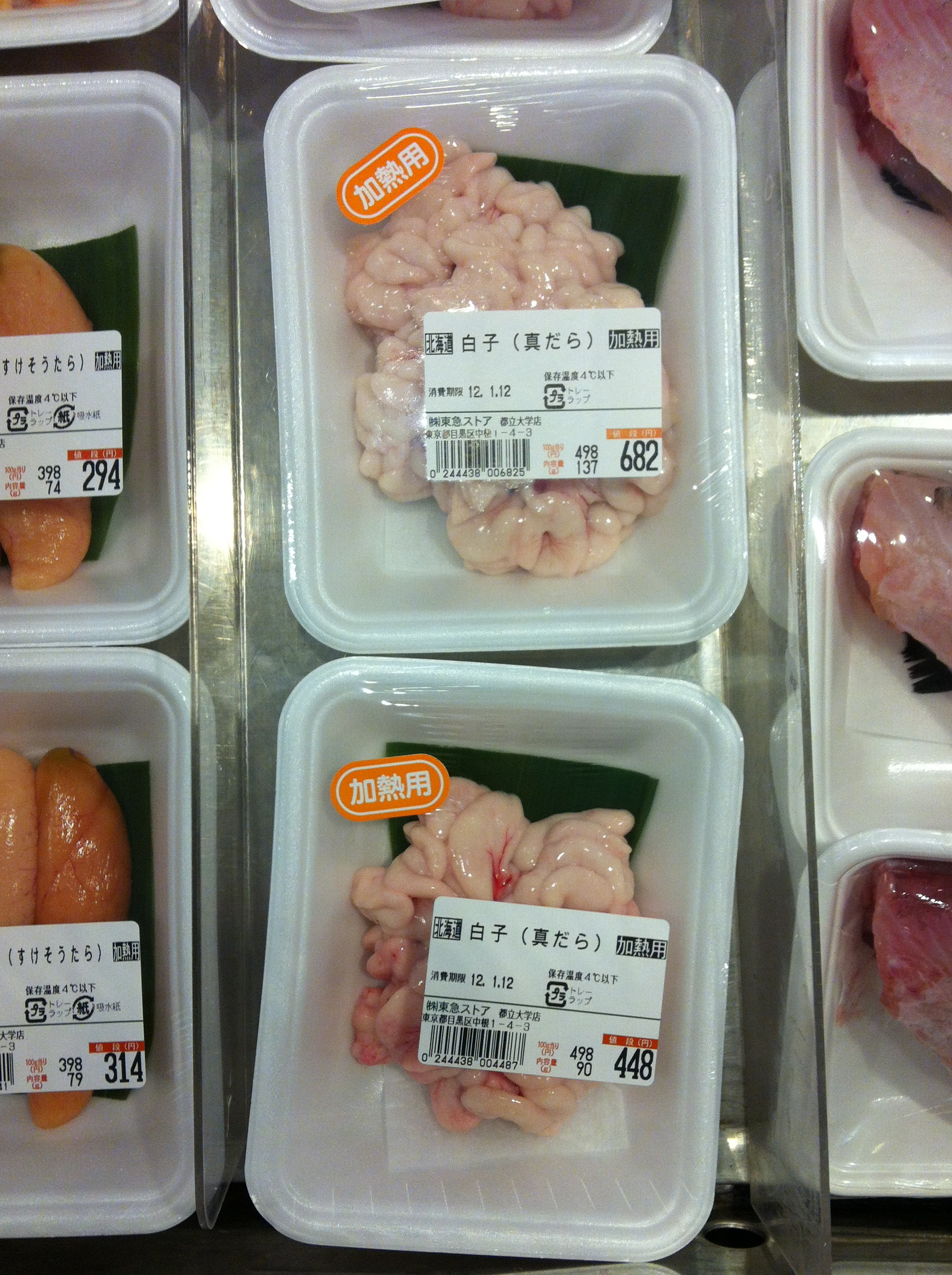 I was browsing the meat section at my local super the other night, trying to get some inspiration for dinner, when I noticed it must be shirako season. Have to say, that fact didn’t help me much with my meal planning, since I pretty much never get a craving for fish testicles. While I have eaten it before – in the spirit of if-it’s-served-to-you-the-only-way-past-it-is-down-the-hatch – it was offered in a far more petite quantity and effectively disguised with spicy grated radish.