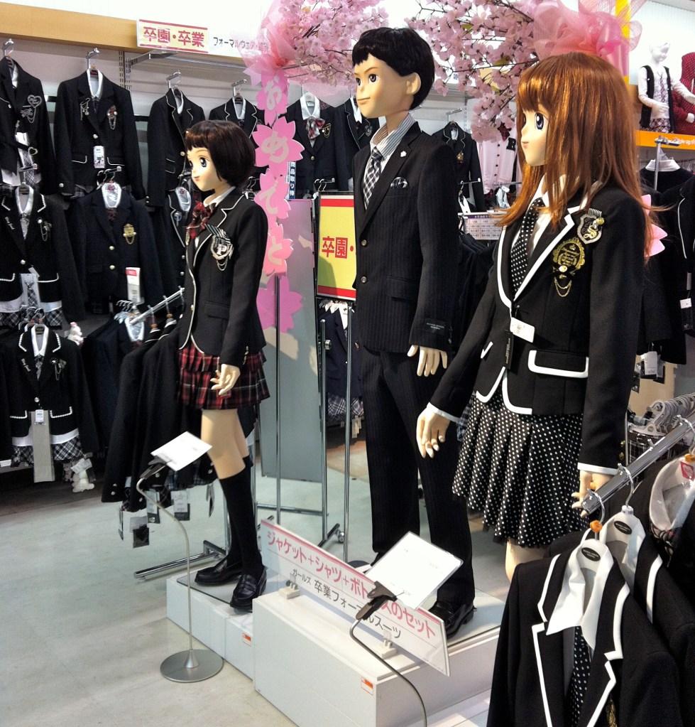 Walking through my local Daiei, I thought there was something a little funny about the display in front of the elementary school book bags. Sure enough, the “girl” in the faux private school uniform definitely got drafted from the boys’ department. Maybe they wanted to ride the cosplay theme set by the anime-style mannequins used in the fashion “uniform” department on the floor below.