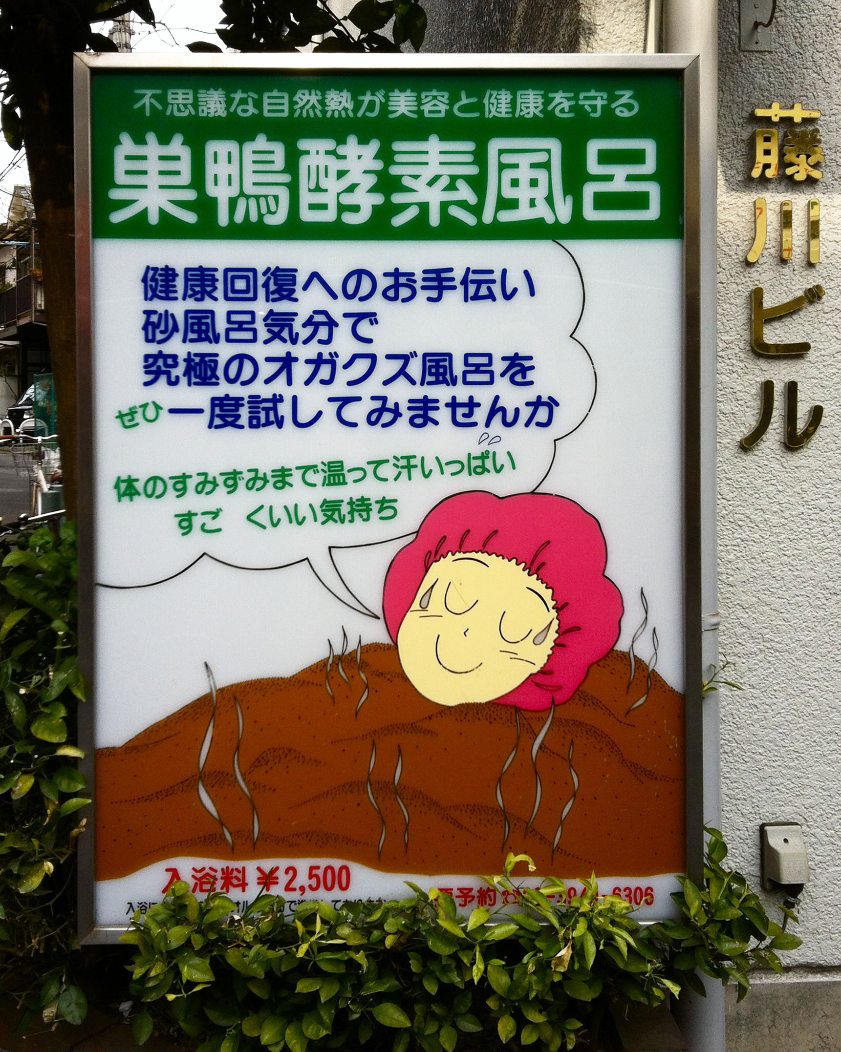 Forget the bubbles and the aromatherapy oil – there’s nothing like a nice hot sand bath to put you back in fighting form! Like the sign says, “It feels really great when the heat penetrates to every corner of your body and you sweat a lot.” Southern Kyushu is famous for sunaburo, where hot springs seep up into beach sand and heat it to sauna-like sweatitude, but apparently there are also a lot of these tucked into Tokyo neighborhoods.