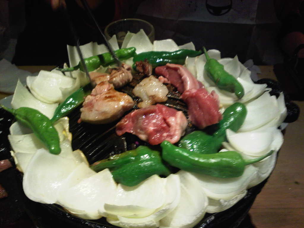 When you sit down at a jingisu kon restaurant, the first thing you do is stuff all your clothing and accessories into a big garbage bag. The ones you can’t decently shed will acquire an aroma of roast lamb that will taunt your fellow subway riders all the way home. After you order up a big platter of raw meat and vegetables, you cook them yourself at the table over a hibachi fitted with a cast iron dome. When each morsel is cooked to perfection, you use it to carry lots and lots of sauce to your mouth. Rinse, repeat, lie face down on the rug.