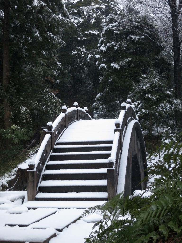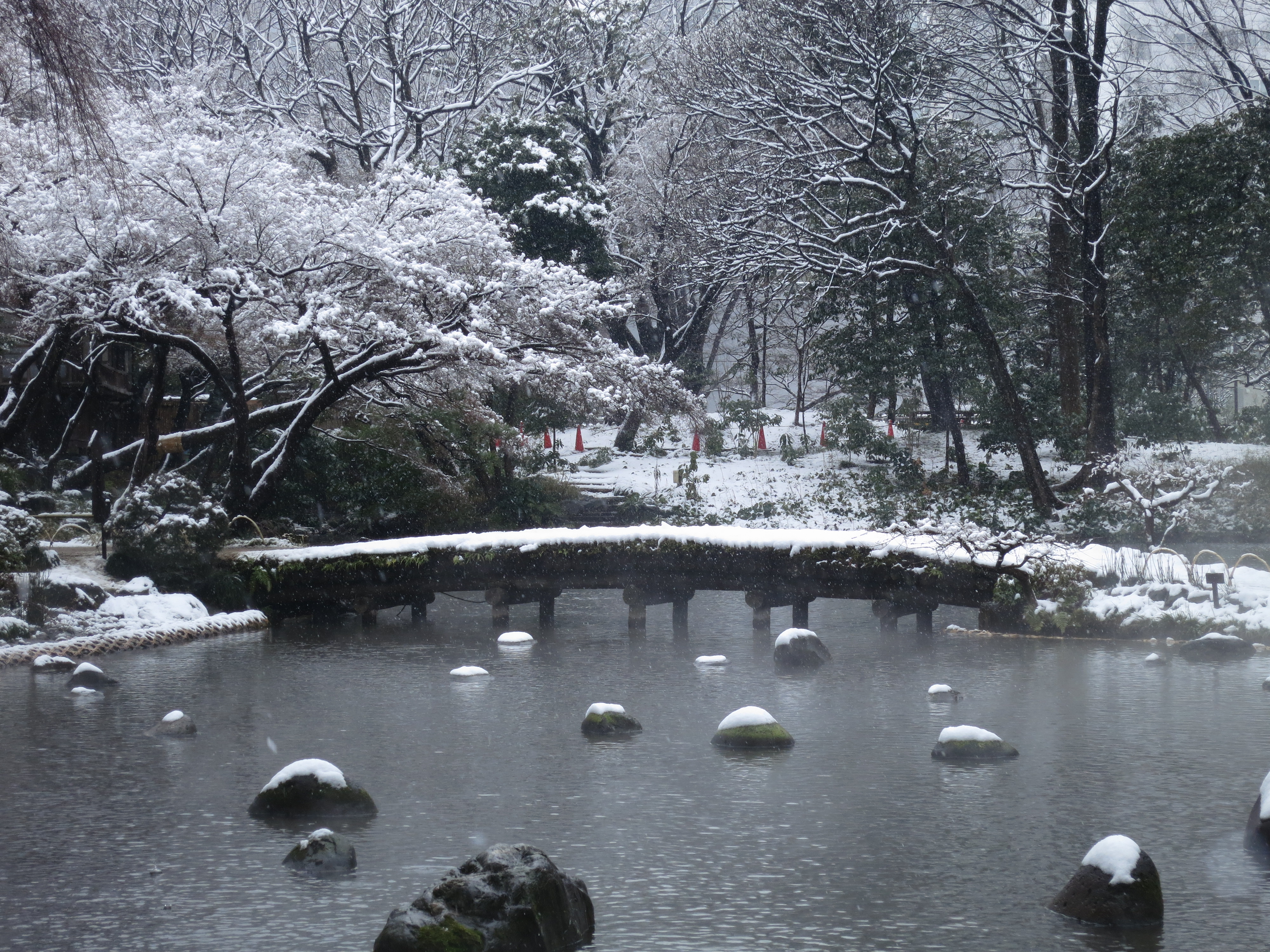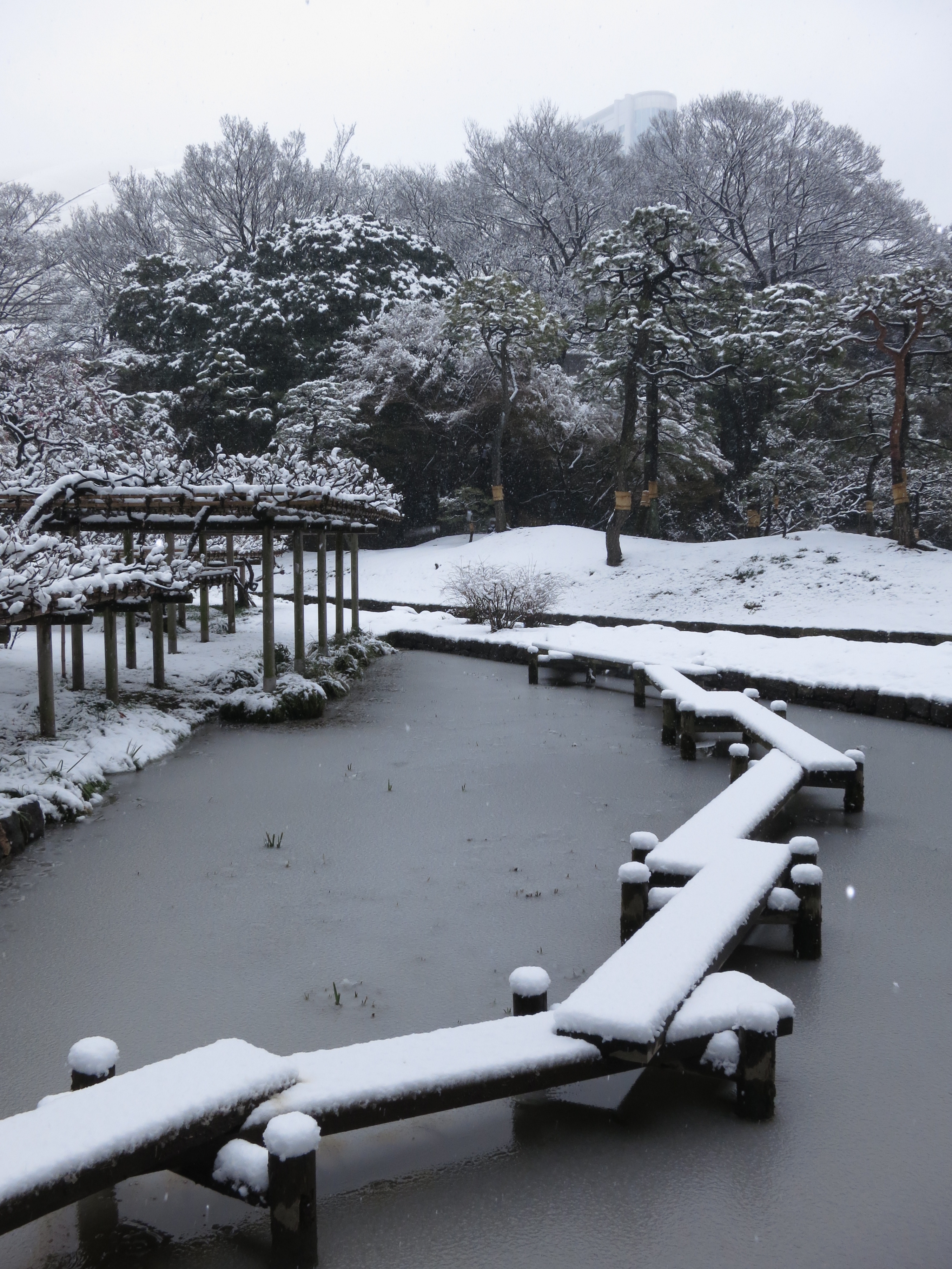 When I woke up Wednesday morning, I looked out the window and was delighted to see it had been snowing since 3:00 a.m. – even my ho-hum neighborhood had a charming blanket of white. There was enough snow to make me want to take pictures of the little puffs on top of the vending machines, but not so much that it was a chore to slog to the train station. It snowed and snowed all morning while I was in class, so I made like a road runner for my favorite Japanese garden the minute the bell rang. For an hour, I walked around, while the temperature climbed and the snowflakes became bigger and wetter. By the time I left, everything was melting. Next day: snow was gone. No shoveling. No devilishly slippery black ice. No grimy lumps lingering on for months like unwelcome houseguests.