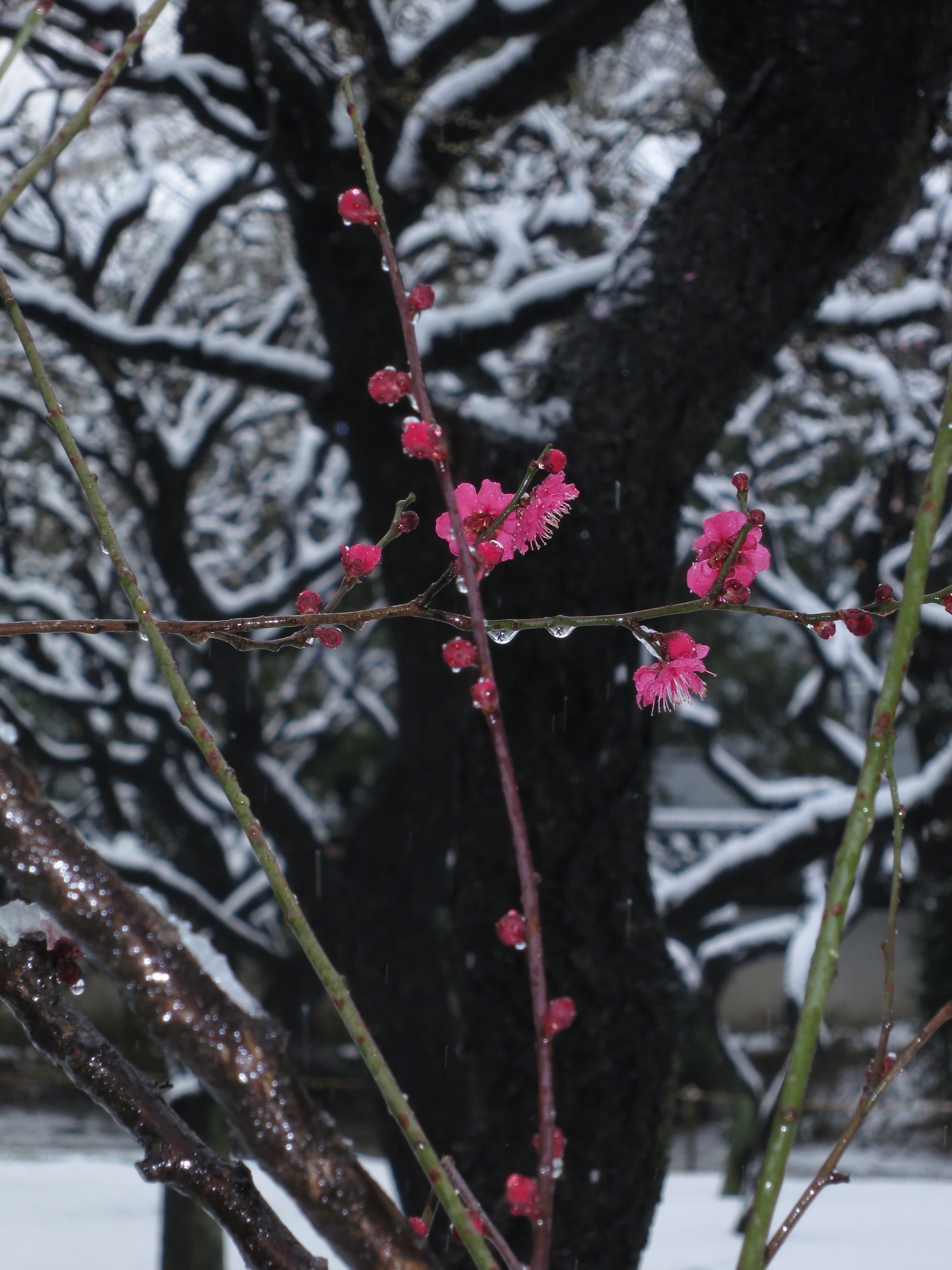 Cherry blossom season is the famous one, but plum blossom season is more interesting, I think. Plum blossoms are admired because they bravely bloom before any other plant, enduring snow and other un-spring-like conditions. Cherry trees burst forth with abandon, in great clouds of pink, but plum flowers are more like punctuation marks on the beautiful shapes of black branches against the snow.