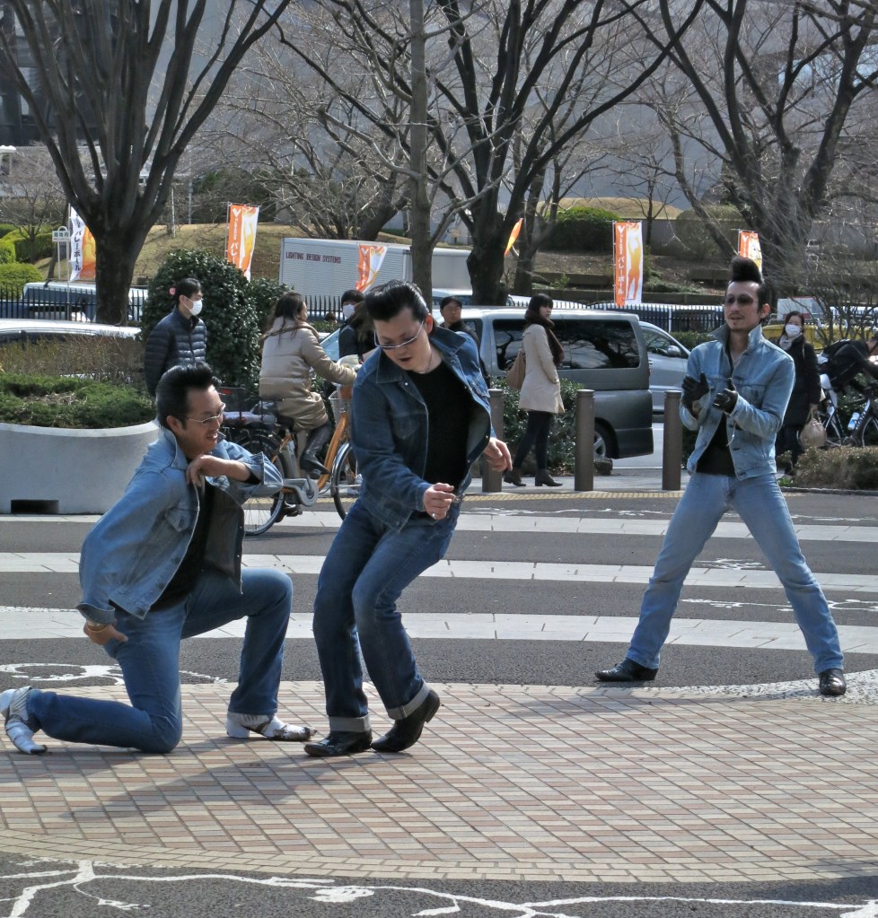 When I went to Yoyogi Park on Sunday, it was still too cold to unzip my jacket, the cherry blossom buds were still tight as fists, and even the dogs were still wearing little hoodie sweatshirts, but I knew that spring had officially come because the rockabilly guys had changed their uniforms. Black leather jackets: out. Denim: in. With their club’s name emblazoned on the back, of course!