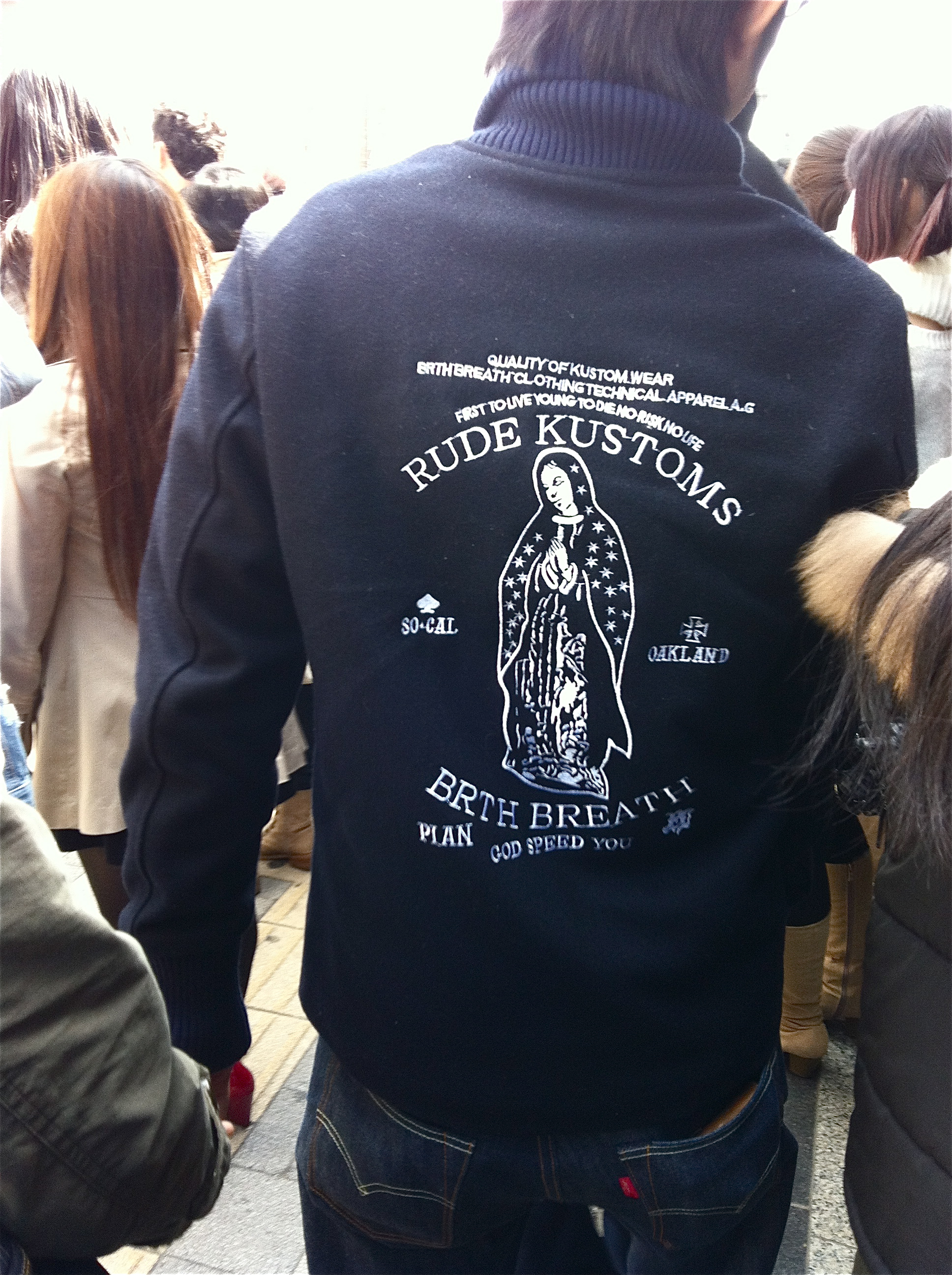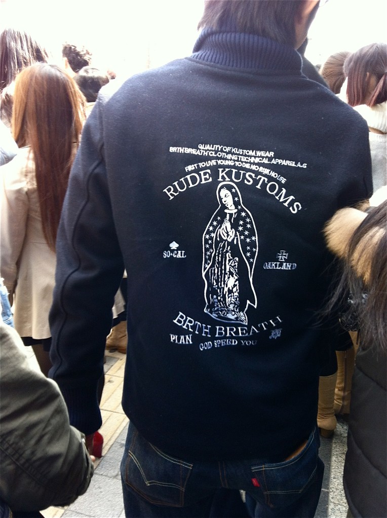 I love articles of clothing that are the Japanese equivalent of Western kanji tattoos that supposedly mean “Strong Warrior” but actually say “Wednesday.” Here, a slightly mannish Our Lady has been pressed into service to perform the miracle of deciphering, “First to live young to die no risk no life,” as well as relocating the entire city of Oakland to southern California. Gotta admit, though, the look is realy kool.