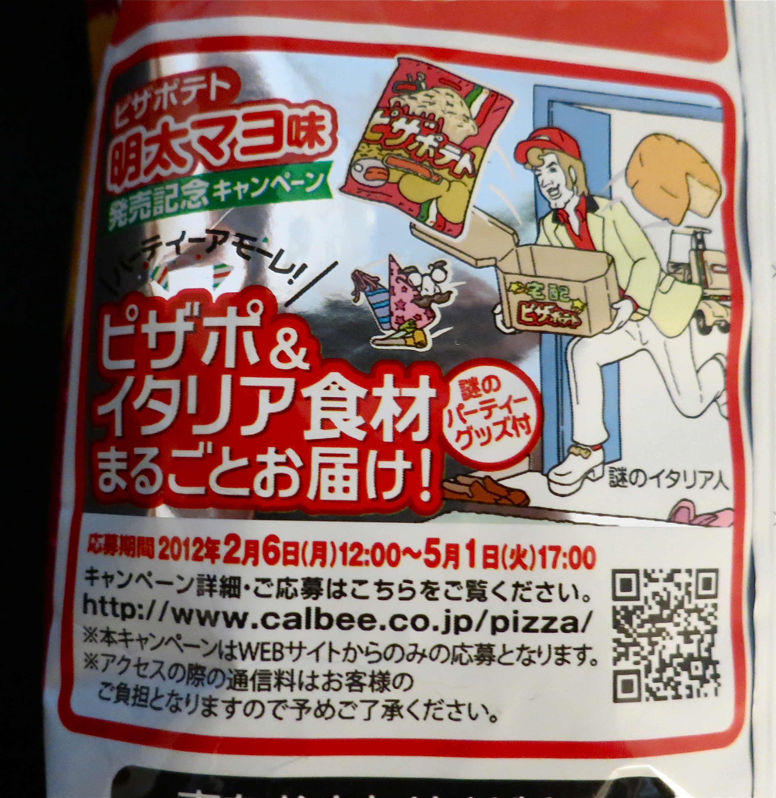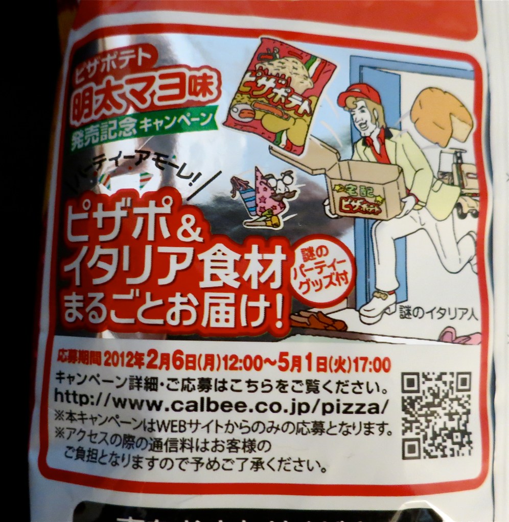 But there’s more! On the back, there’s a special offer! I was extremely disappointed to discover I just missed the deadline to get my giant party pack of Fish Egg Mayo Pizza Chips delivered to my door by a real live Italian person wearing platform shoes and a party hat!
