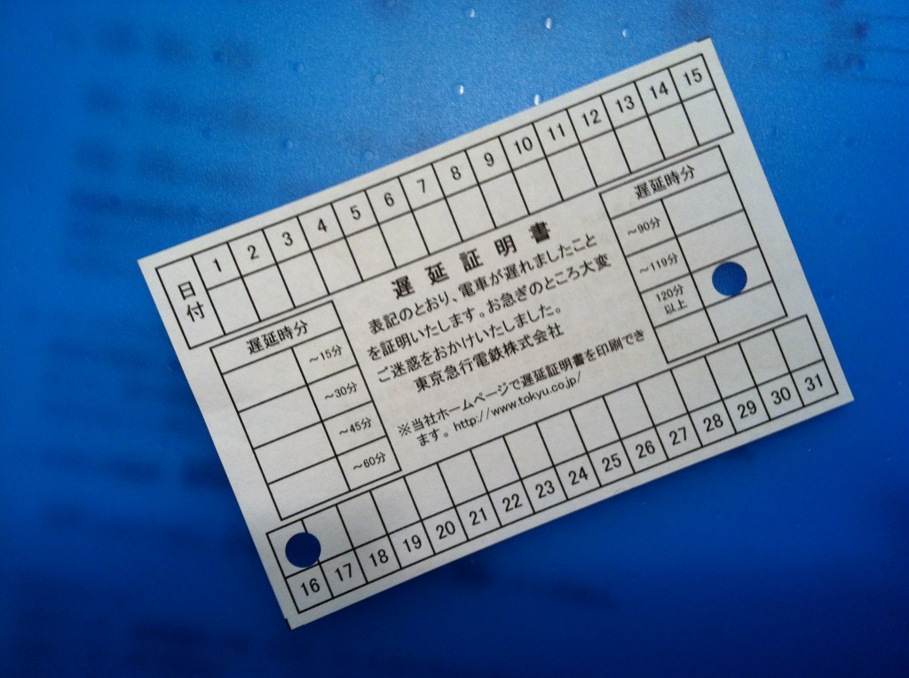 The pass is printed with the name of the train line so scofflaws can’t cop one from the ever-delayed Chuo line even though they take the reliable Yamanote, and punched to show the date and the length of delay. If you’re as lucky as I was, you’ll get the maximum “over 120 minutes” punch, allowing you to saunter into the office (or, in my case, class) two hours late without affecting your all-important attendance record.