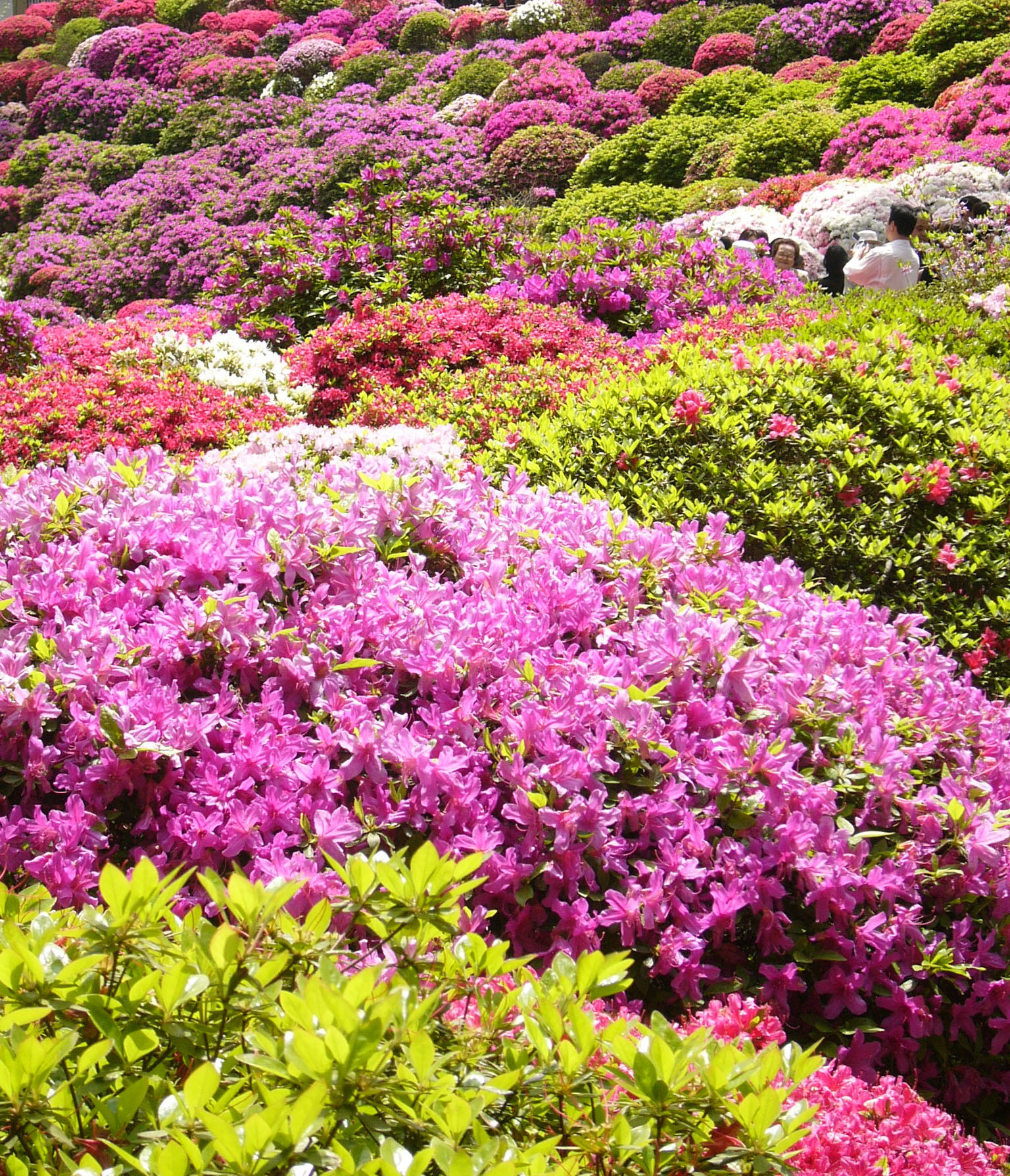 I mean, cherry trees are nice and all, but right now everywhere in Tokyo the azaleas are blooming, and they’re AMAZING.They come in other colors besides pink! Sometimes there’s even more than one color on the same bush! Whole hillsides (see below) are covered with blazing balls of blooming for weeks during April and early May!