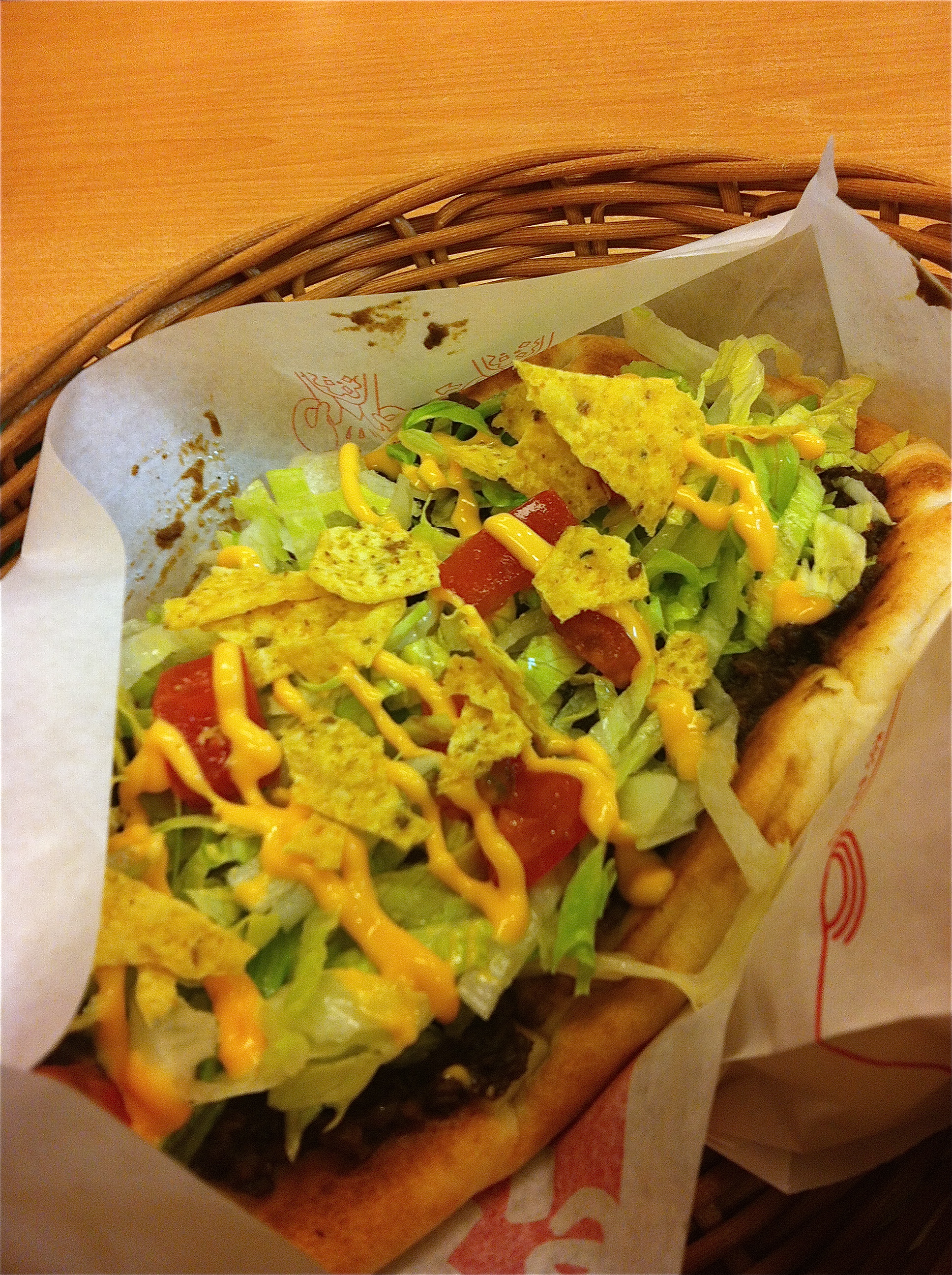 It was…interesting. The tortilla chip crumbs, lettuce, tomato and Cheese Wiz all pretty much tasted as expected, but the oddly dark ground meat foundation was a marvel of sweetish strangeness, revealing that Japanese focus groups apparently don’t hate cumin. I did eat the whole thing, though. Go figure.