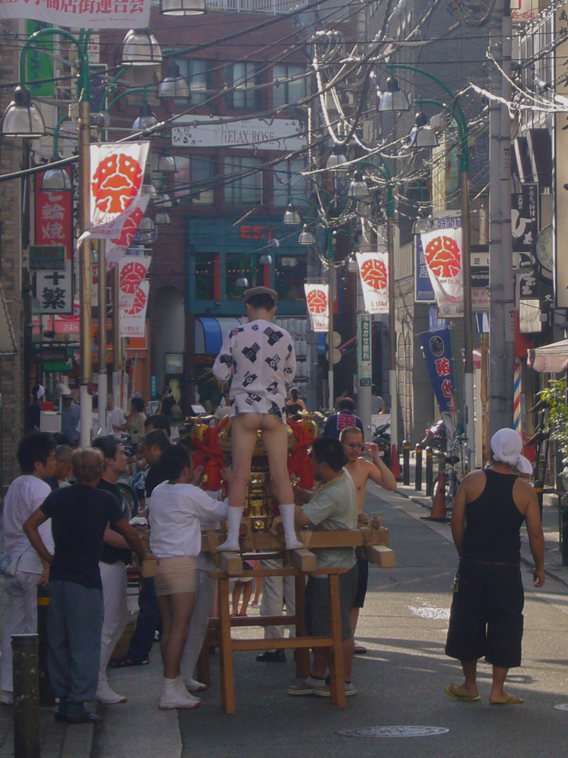 Seriously, which would you rather have? Long-faced celibate guys in brown robes or strapping Japanese dudes in fundoshi (see above)? It’s fall festival season here in Japan right now, and it’s the duty of every neighborhood to take the local gods out and show them a good time. Fortunately, Shinto gods do not go in for that fasting and scourging business. They are all about eat (mitarashi dango!), drink (sake and beer, most definitely not in moderation) and be merry (dancing in the streets, shouting WA SHOI)!