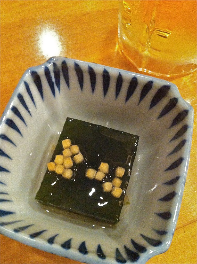Sadly, it didn’t have pineapple, fruit cocktail OR marshmallows in it. This square of wiggly was chock full of algae, algae, and more algae! Made from nori (the wrap on tuna tekkamaki at your favorite sushi bar), it was held together with just enough agar (the growth medium in petri dishes at your favorite laboratory) to make it easy to neatly quarter and convey to your mouth via chopsticks.