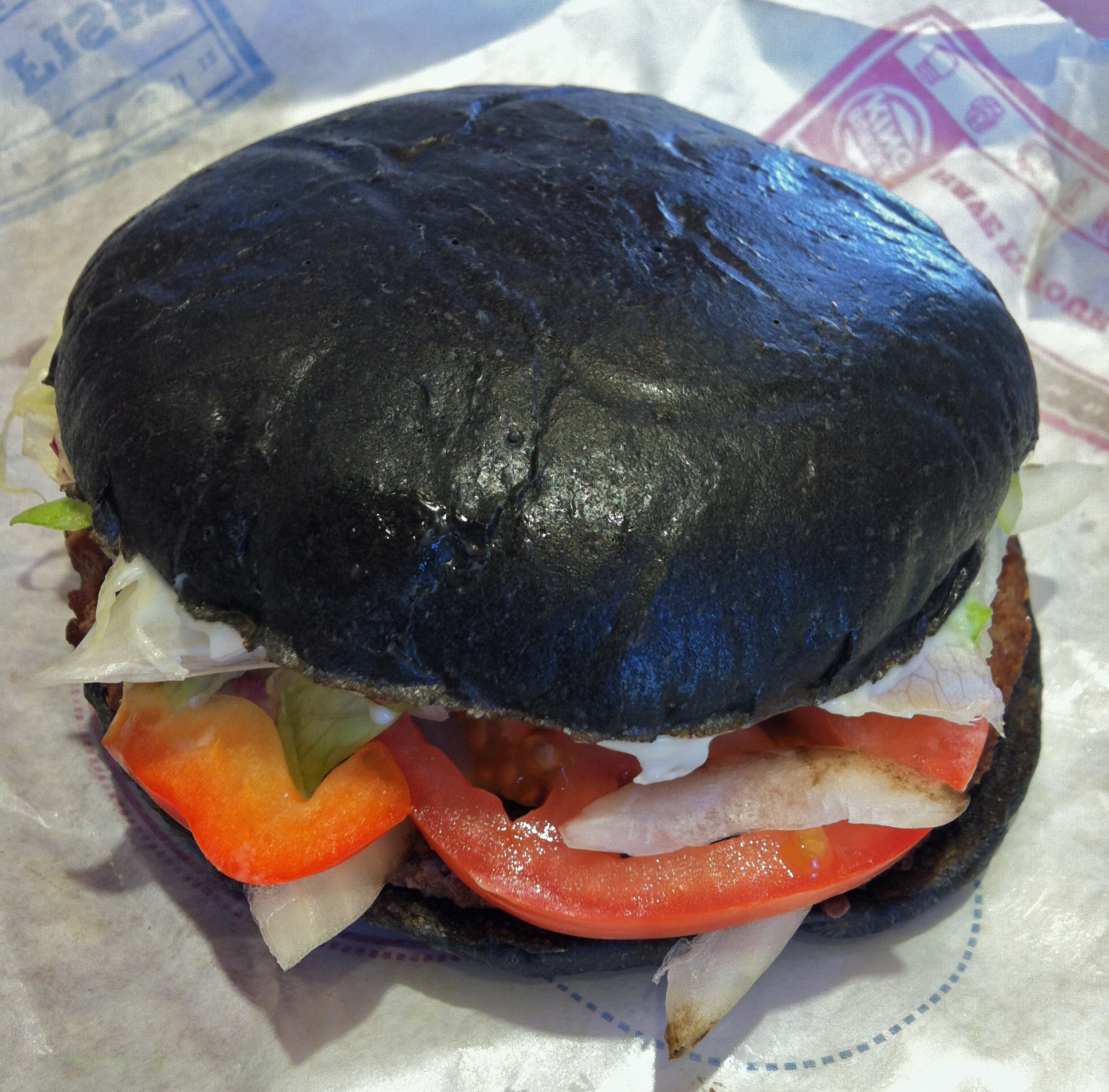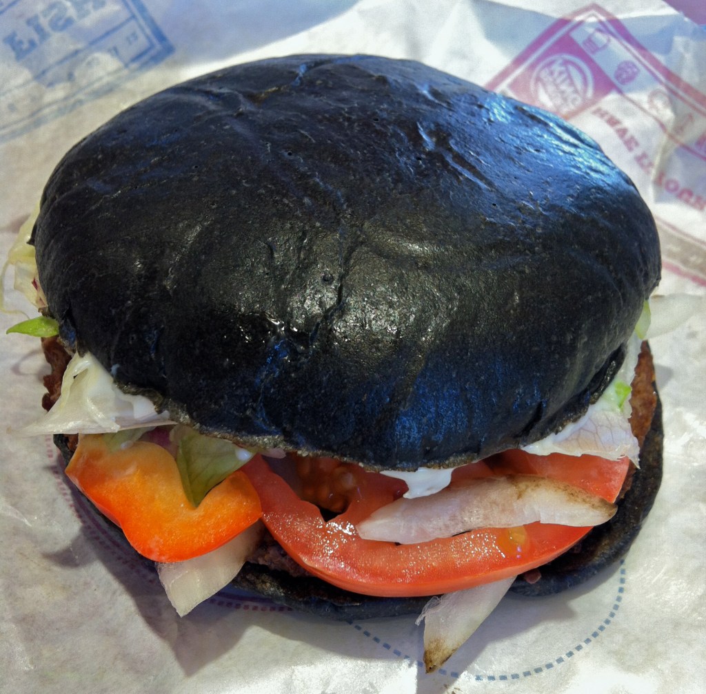 And fortunately, Burger King did not disappoint! Behold the Kuro Burger, with a bun chock full o’ bamboo charcoal and ketchup made from squid ink! I was poised to snark, but…yes please, I think I’ll have another!