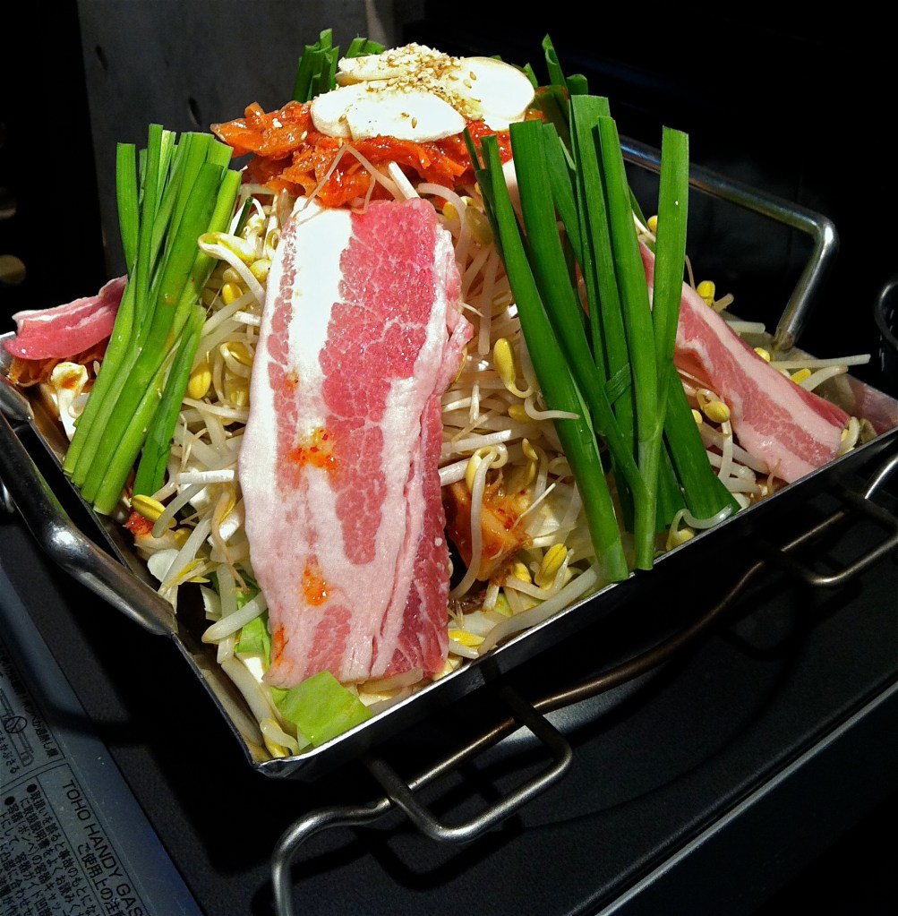 Cheery little burner is lit, pile of awesome-looking stuff begins to melt down, mingling juices bubble merrily, and finally, finally, finally, servings are ladled out! Oh, no. Lurking under that innocent-looking pile of vegetables and strips of bacon-y meat are, yes, big chunks of…cow stomach. Those puffy bits are intestines and that rubbery, waffly-looking thing is tripe, I just know it. But my Japanese friend is tucking in with delight, so butch up, little missy. It won’t kill you if you wolf it down really fast and chase it with some beer.