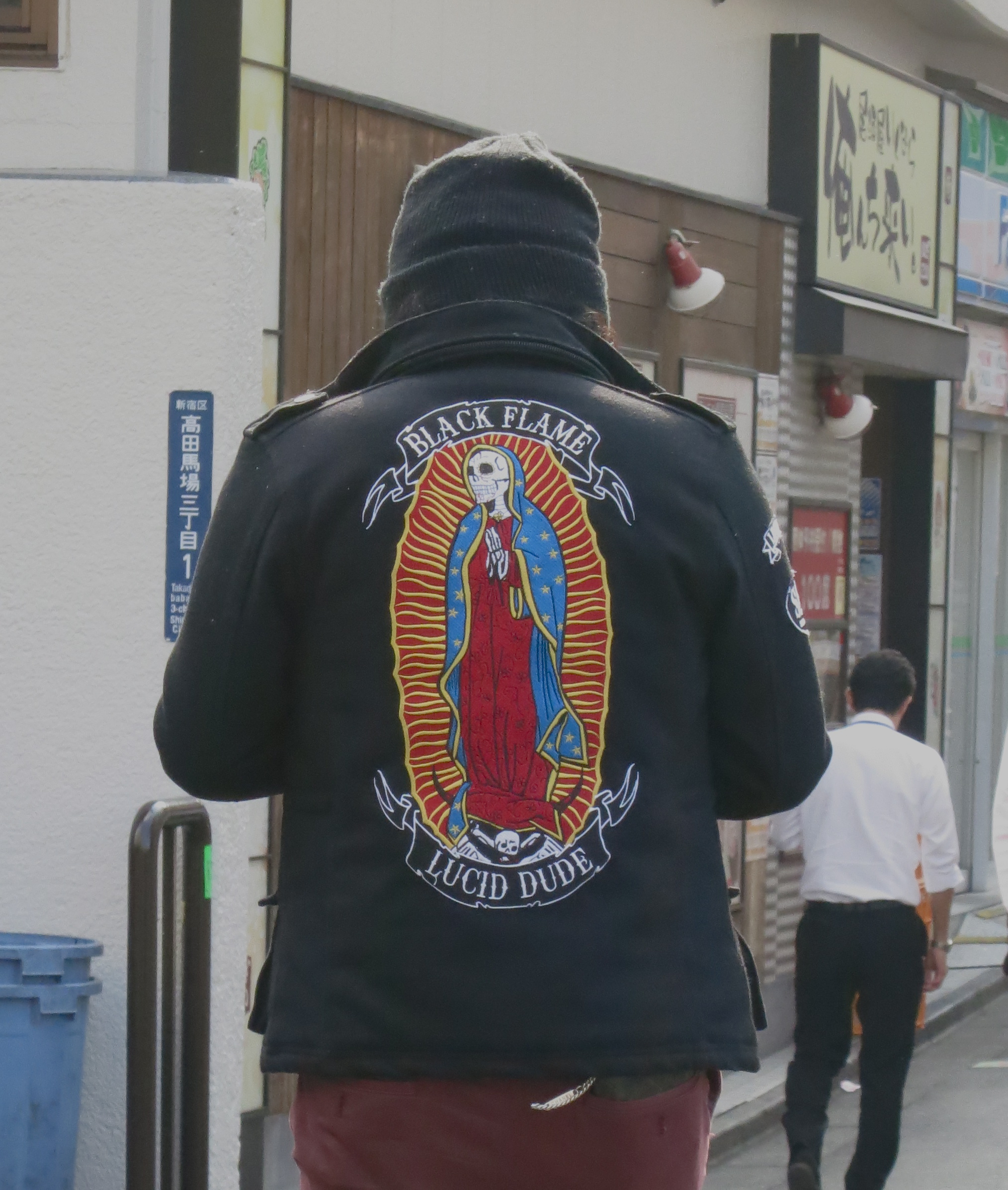Our Lady seems to have been on a rather severe diet since we last encountered her on the back of a stylin’ blade’s jacket, but she’s still doing her best to confer righteous coolness on all comers. The question is, what exactly is a Lucid Dude, and why would anyone want to be publicly identified as one? Perhaps Our Lady of Glow In the Dark can enlighten us…