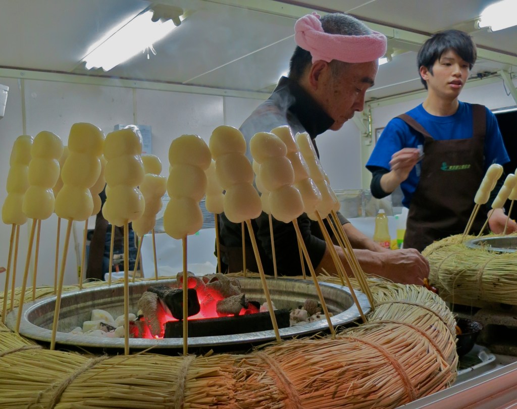 I’ve waited ALL YEAR for the Rikugi-en garden in Komagome to open up at night again for leaf-viewing, just so I can eat these gooey balls of delishitude on a stick. Skewered up and stuck in an old-fashioned rice-straw wreath, the freshly-pounded rice balls slowly melt into warm blobs of goodness, then are slathered in either miso or soy-based sauce. (I mention the latter only as a courtesy. Miso, all the way.)