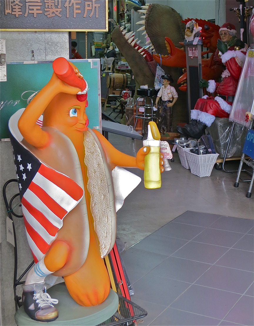 This shop on Kappabashi street in Tokyo’s restaurant supply district specializes in custom-made props. In addition to Rex the Friendly Tyrannosaur, today’s stock included Mr. Menacing Lobster, the Lonesome Cowboy, Santa Claus and the Missus, and Squirty the  Cheerful Hot Dog.