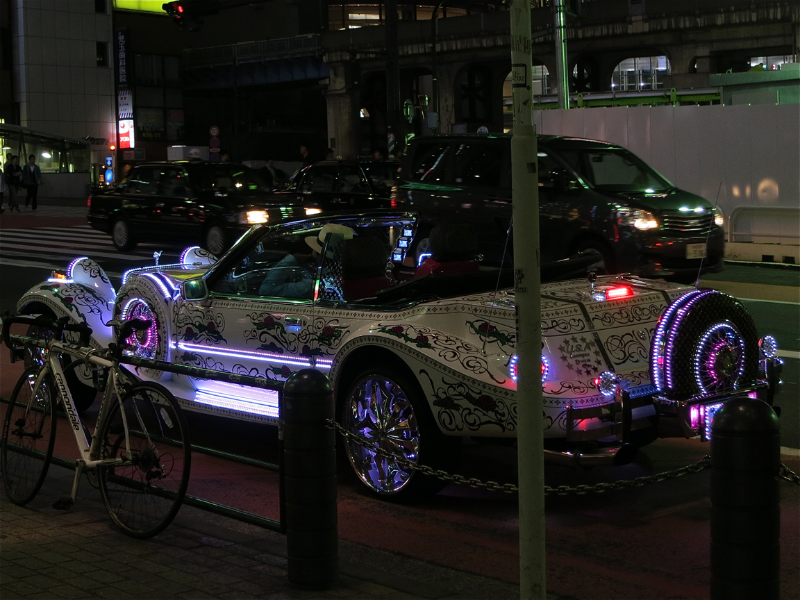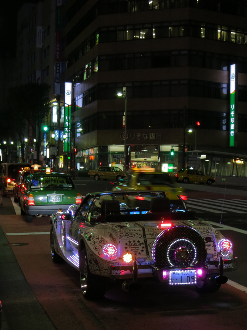 I’d whipped out my camera to capture some arty-farty reflections of the Shibuya neon on cabs stuck at a traffic light, and when I looked at the display YOWZERS there was this CAR! And because traffic getting through Shibuya was wicked slow even at midnight, Lady Luck smiled upon me and gave me a half a minute to chase it down the street where it was stopped at a traffic light and get a couple more shots as it vroomed off into the dark.