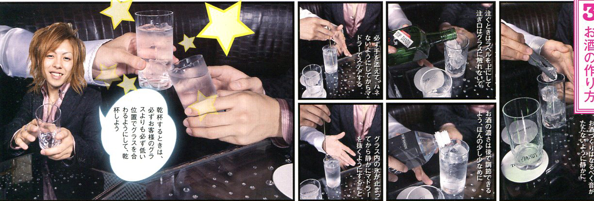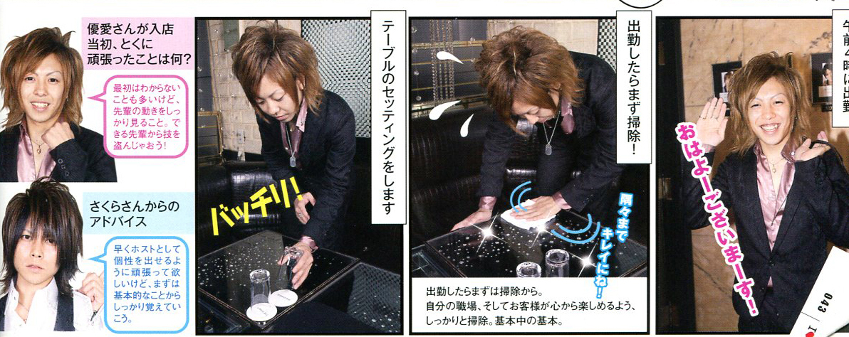 Yua starts his workday doing the scut work: wiping down the tables until they gleam to the manager’s satisfaction, setting up the first customer’s glasses, ice bucket, tongs and ashtray, and doing even less glamorous things like cleaning the toilets. His mentor advises him that even though these jobs are not exciting, if he does a good job, he’ll prove himself to the manager as a hard worker and will graduate to being a top-earning entertainer faster.
