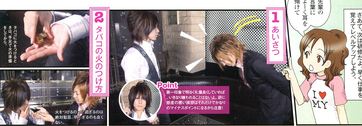 Okay, it’s almost time for the club to open! Before the first customer arrives, Yua must do a proper “aisatsu” to his mentor, bowing respectfully and asking Sakura-san to do him the great favor of teaching him  the proper way to become a good host. If Yua diligently does everything Sakura asks him to do and thanks him properly for teaching him (even when Sakura scolds him for making a mistake), Sakura will return the favor by introducing him to his customers and helping him build a customer base of his own. Today Sakura will teach Yua how to light a customer’s cigarette. Sakura shows Yua how to flick his lighter to life, cupping it in his hand near himself so as not to endanger the customer, then light the end of her smoke with a graceful gesture.