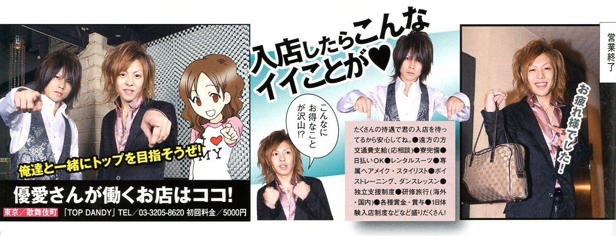 We’re left with the  parting message that good-looking guys who think this might be the ideal job for them should know that the mentors at the sponsoring club (Top Dandy) will not only train them to become top-earning hosts in no time, the club also offers snazzy designer suits for rent until the nouveau host can afford his own, the job is flexible and hosts can get their pay at the end of every workday, they can make use of the hair-make stylist who comes to the club every day before it opens, the club will pay for singing and dancing lessons, the club will pay for all the hosts to go on vacation together (sometimes to foreign countries!), and if they make it into the top five earners, they’ll really level up to the big money, with bonuses on top of their salaries and a percentage of their dedicated customers’ bar tabs.