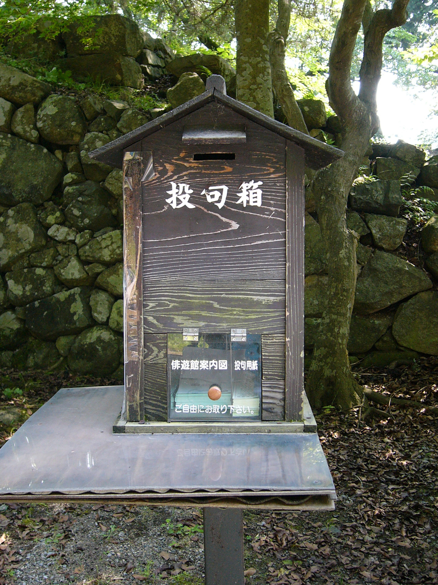 Wandering the grounds at Hikone Castle, I came across this curious little box on a post. It had cards, it had a writing shelf, it had a slot for depositing the cards after one had used the writing shelf. I couldn’t read the kanji on the front. What was it? A suggestion box? Why would they put a suggestion box in the middle of Hikone Castle?
