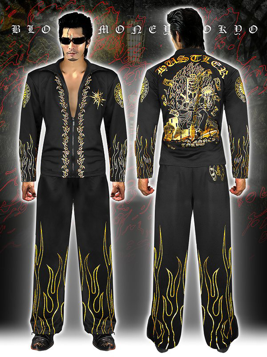 If you’re planning to shake down a few grannies or threaten some loan-shirkers with a Louisville Slugger, don’t leave the house without donning your Blood Money brand track suit! Fashioned from pure 100% shiny synthetic fibers printed with righteous gold vinyl designs, you can’t fail to command respect in these chest-baring togs. Zippers and elastic waist design make for easy on and off when it’s time to wash those pesky body fluids out at laundry time.
