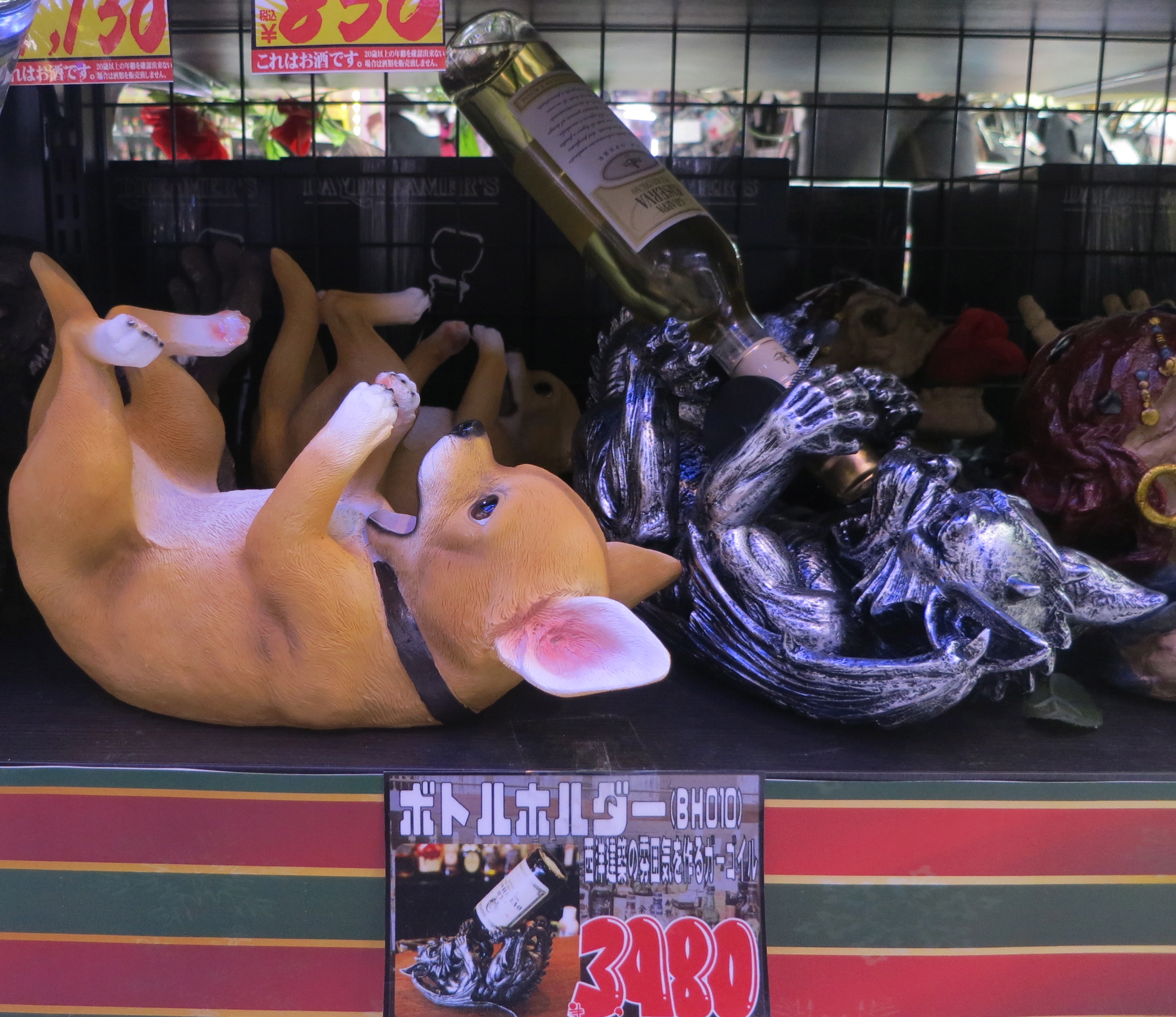 Forget the shots, this Chihuahua is going for the chug. Seen at (where else?) Don Kihote, Ikebukuro.