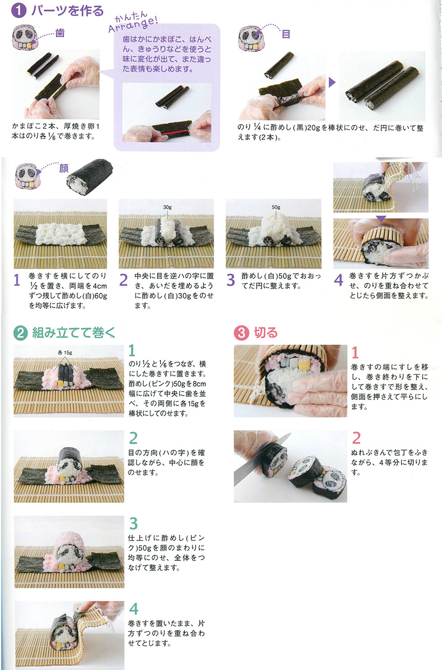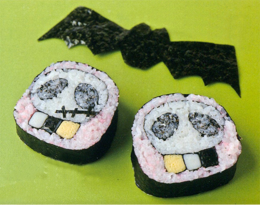 Okay, bento warriors, here’s your chance to show the lunchroom what you’re really made of! Step by step instructions for making skull-tastic sushi rolls from any old scraps of rice, omelet and seaweed you happen to have lying around the house! No need to painstakingly translate all that pesky Japanese – just make like a monkey and follow the pictures! Protective surgical gloves are, er, optional.