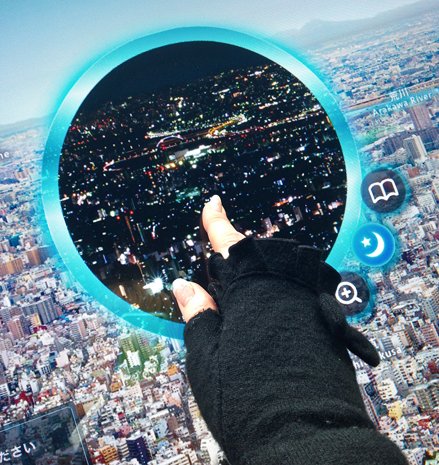 Fortunately for us view-challenged types, every vista is equipped with massive photo touchscreens that have a quasi-nifty interactive feature that lets you point your finger anywhere and move around a magnified and/or night view of what would be right outside the window if only there weren’t so many damn clouds in the way.