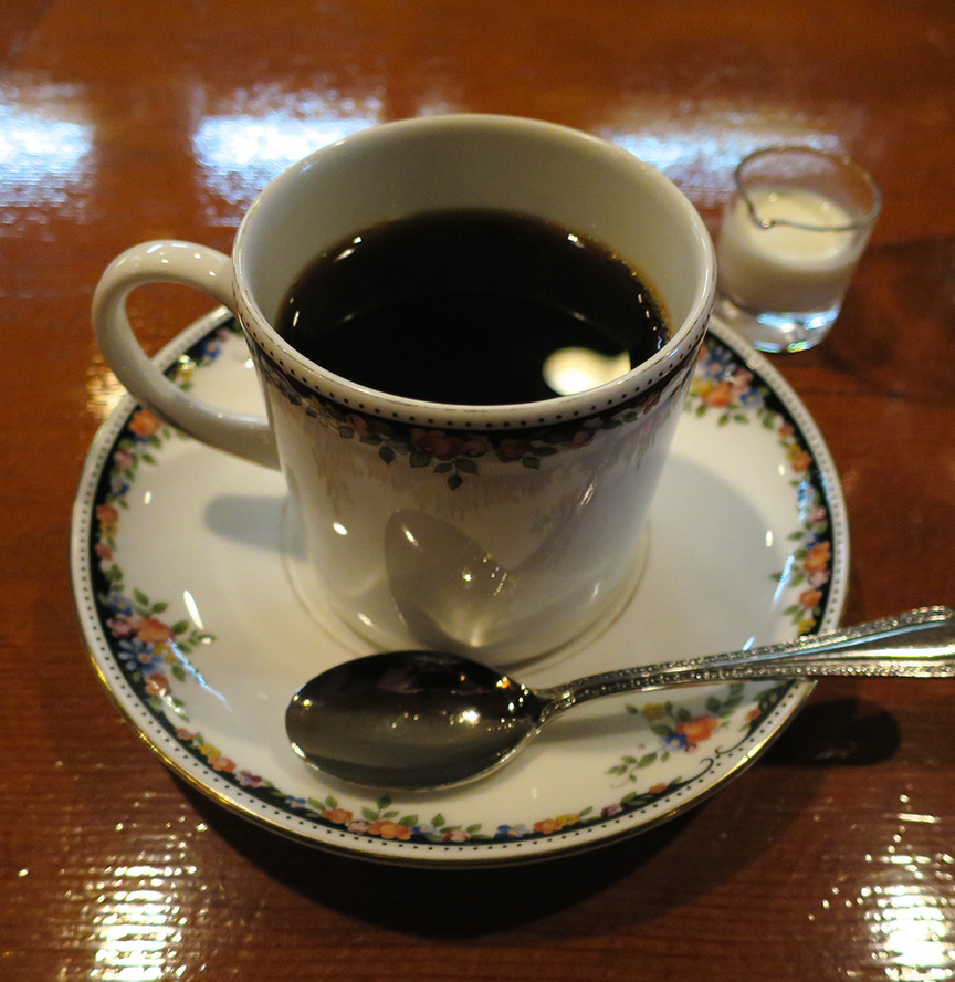 Naturally – this seems to be a requirement for Best In The World – it’s not easy to find. Tucked away from the street on the ground floor of a narrow building near Ginza Ichome station, I almost missed it. It didn’t look like a coffee shop – more like a bar. Dark inside, even in the middle of the day. But the second I walked through the door, I was immersed in the pre-war clarinet jazz of Sidney Bechet and the mingling aromas of coffee and cigarettes,* and was transported back in time to that grainy newsreel-ish, pre-war age.