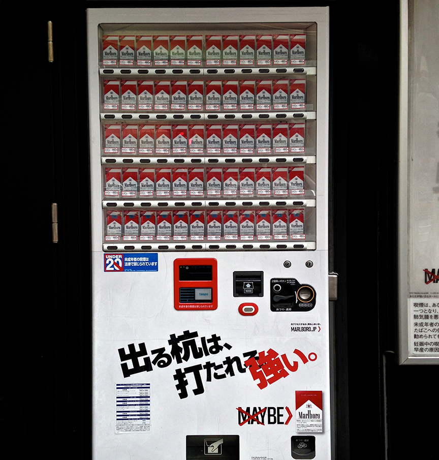 This vending machine offers you a choice between Marlboros and…Marlboros. It could be a glimpse of some horrible apocalyptic future in which the only beer left on Earth is Miller Light and the only mayo is Miracle Whip, or it could be the latest example of a popular Japanese advertising trend: make the product stand out on the shelf by…buying up all the shelves.