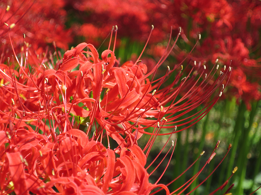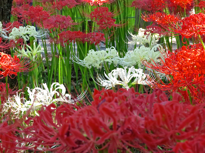 Last week I went with some Japanese friends to Kinchakuda, a flower park near Koma Station, and the spidery red lilies did not disappoint! These members of the amaryllis family are called higanbana – “equinox flowers” – because in Japan they bloom just as summer slips into autumn, at the moment when the night becomes the same length as the day.
