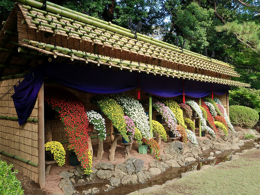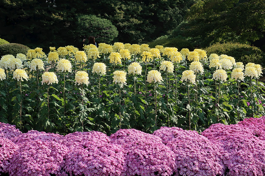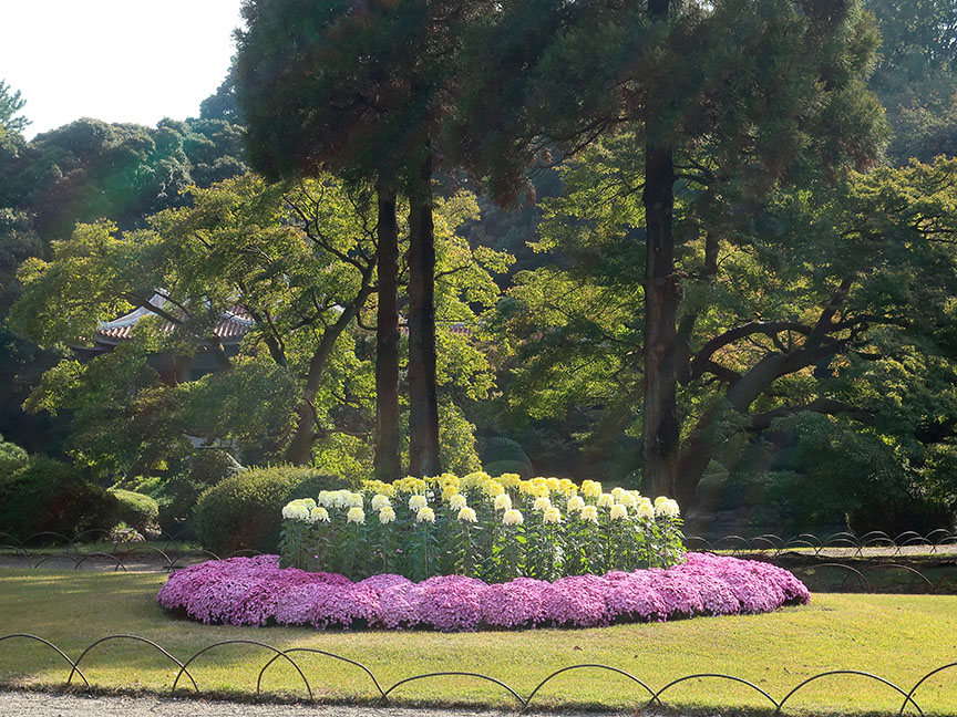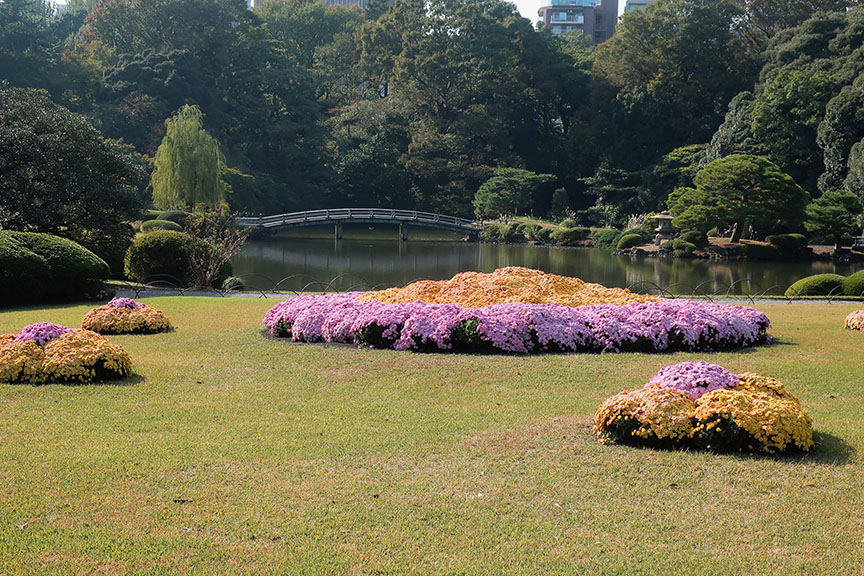 But one of the things I like best about the chrysanthemums at Shinjuku Gyouen is the displays that are part of the landscape, like this beauty set along my favorite strolling path