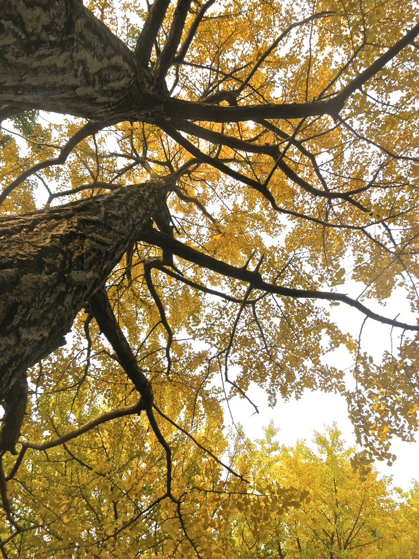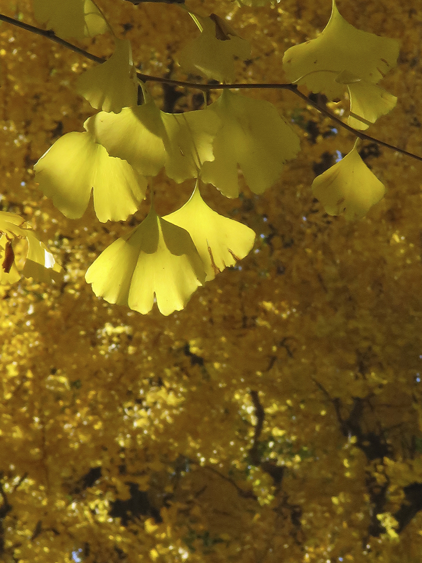 Towering ginkgo trees are bright yellow, starting in mid-November.