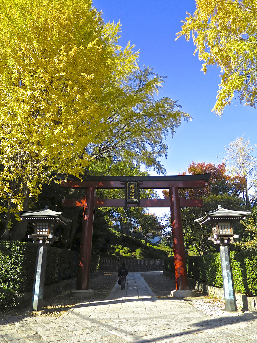 Golden ginkgo trees shade the red torii gate at the Nezu Shrine, starting in mid-November.