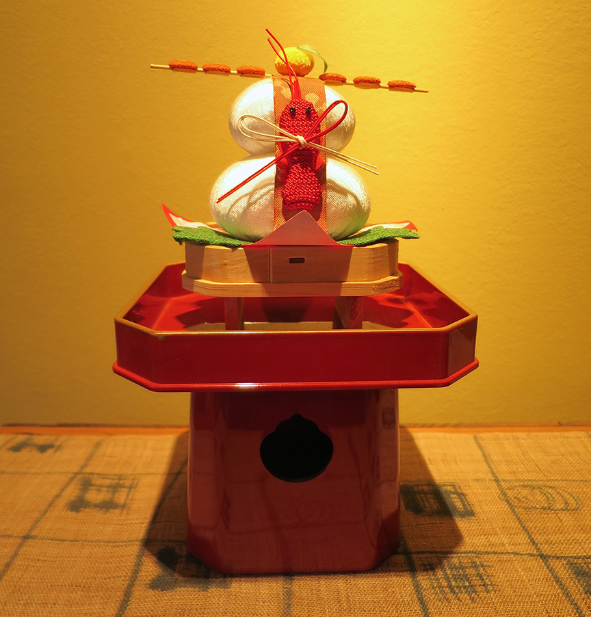 The white things stacked on this lacquer stand are kagami mochi – “mirror” rice cakes that give a tip o’ the beanie to the sun goddess who shut herself in a cave to pout, plunging the earth into darkness until she was lured out by catching a glimpse of herself in a mirror held up by a fellow goddess. (This is just a little fake one, but last year I posted a picture of the biggest real one I’ve ever seen!)