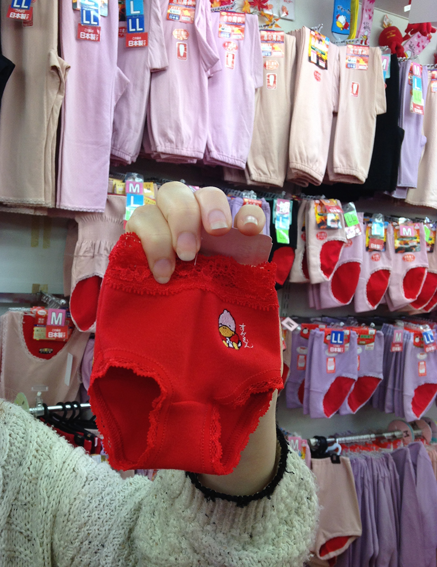 So, there’s this street in Tokyo I’ve written about before that’s known as the “Grandma & Grandpa’s Harajuku” because it’s where all the oldsters go to stock up on the latest elderly comforts and fashions. My favorite store on Koshinzuka Street is the “Red Underpants” shop, which specializes in many, many, MANY styles of lucky red underwear (none of them remotely resembling thongs).* These powerful panties even come with special instruction for use, so you don’t find yourself kept awake by their mighty redness.