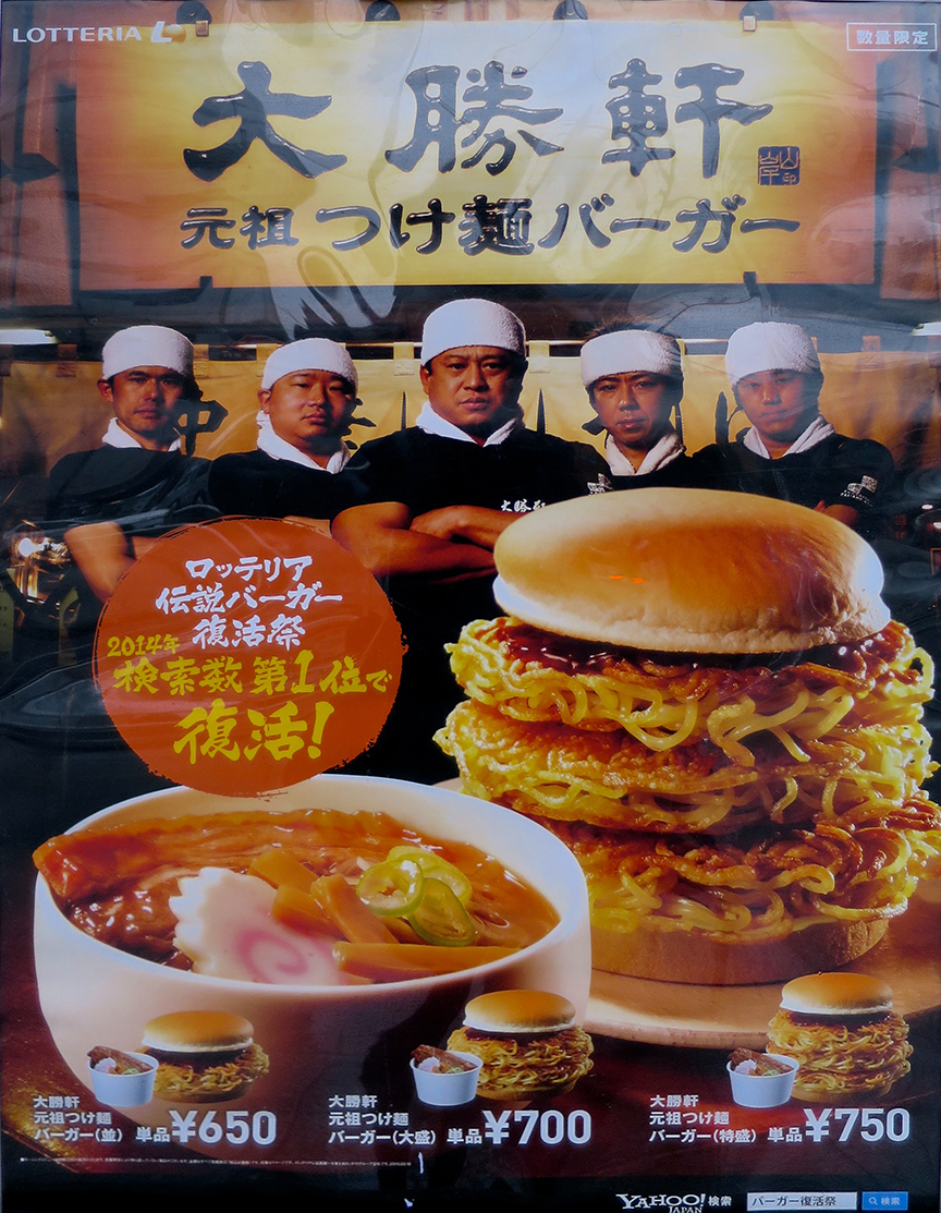 Just when you thought America had cornered the market when it came to eating ALL the carbs, Japanese burger chain Loteria one-ups the red-white-‘n-blue with this tri-deck noodle monster.