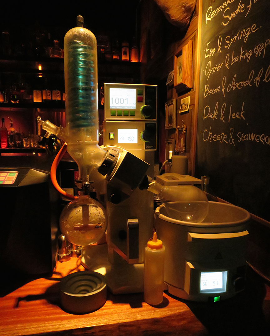 And this is the magical Rotovapor! It distills flavors from all kinds of unlikely sources to make spirits that taste like everything from foie gras to bamboo leaf.